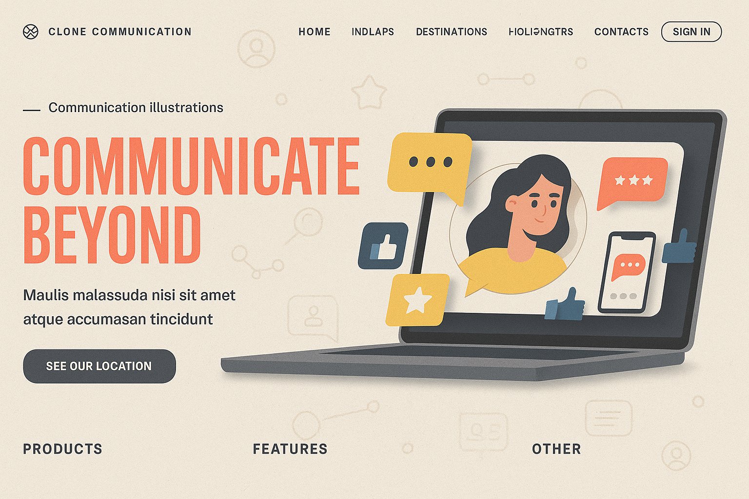 A contemporary landing page featuring a laptop with communication illustrations. Bold typography and vibrant colors create an engaging user interface.
