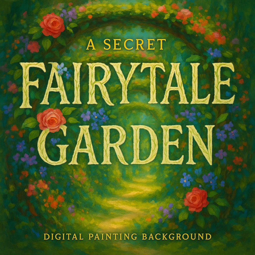 Enchanting digital painting depicting a vibrant fairytale garden, ideal for use as a background in storytelling, illustrations, or creative projects.