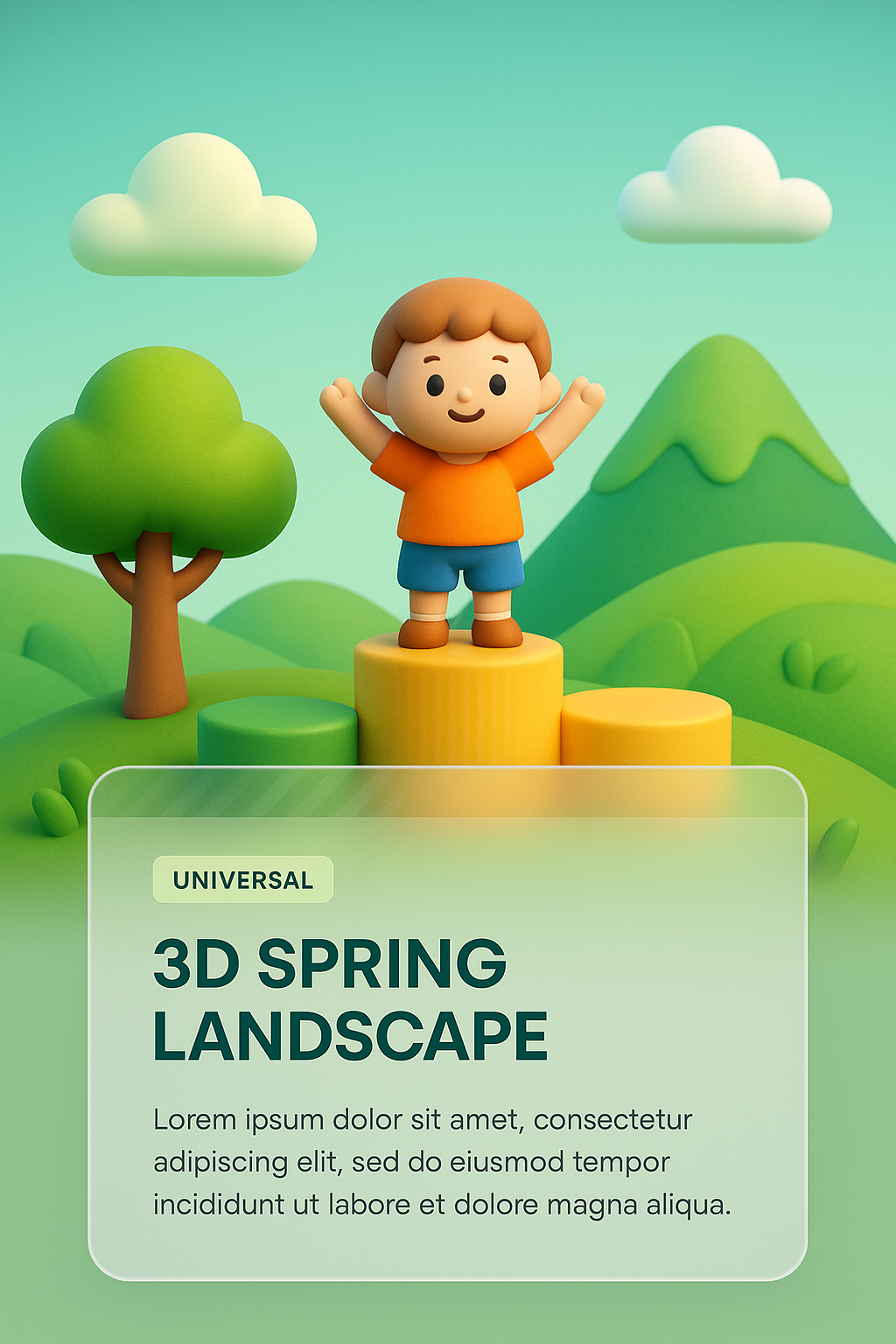 /Collection: /by davooda/Type: PNG/A vibrant 3D illustration featuring a joyful child on a podium amidst green hills, with trees and clouds creating a playful spring landscape. Ideal for children's content.