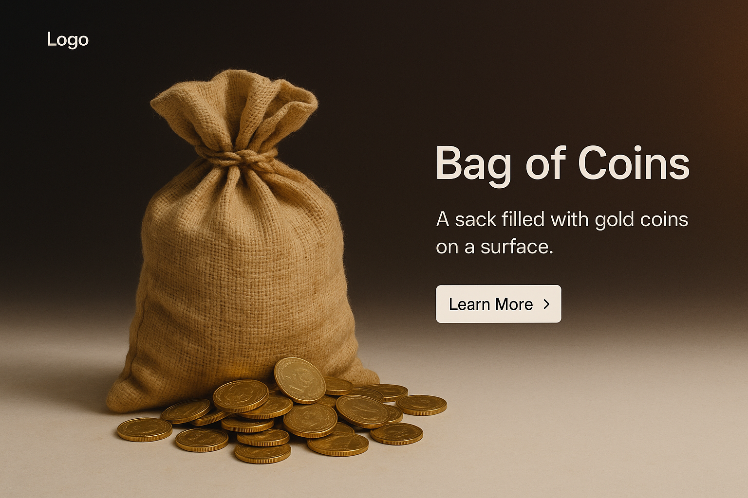 A stylish bag filled with gold coins sits on a smooth surface, accompanied by a clean call-to-action button. The design features a muted background gradient, enhancing the focus on the bag.