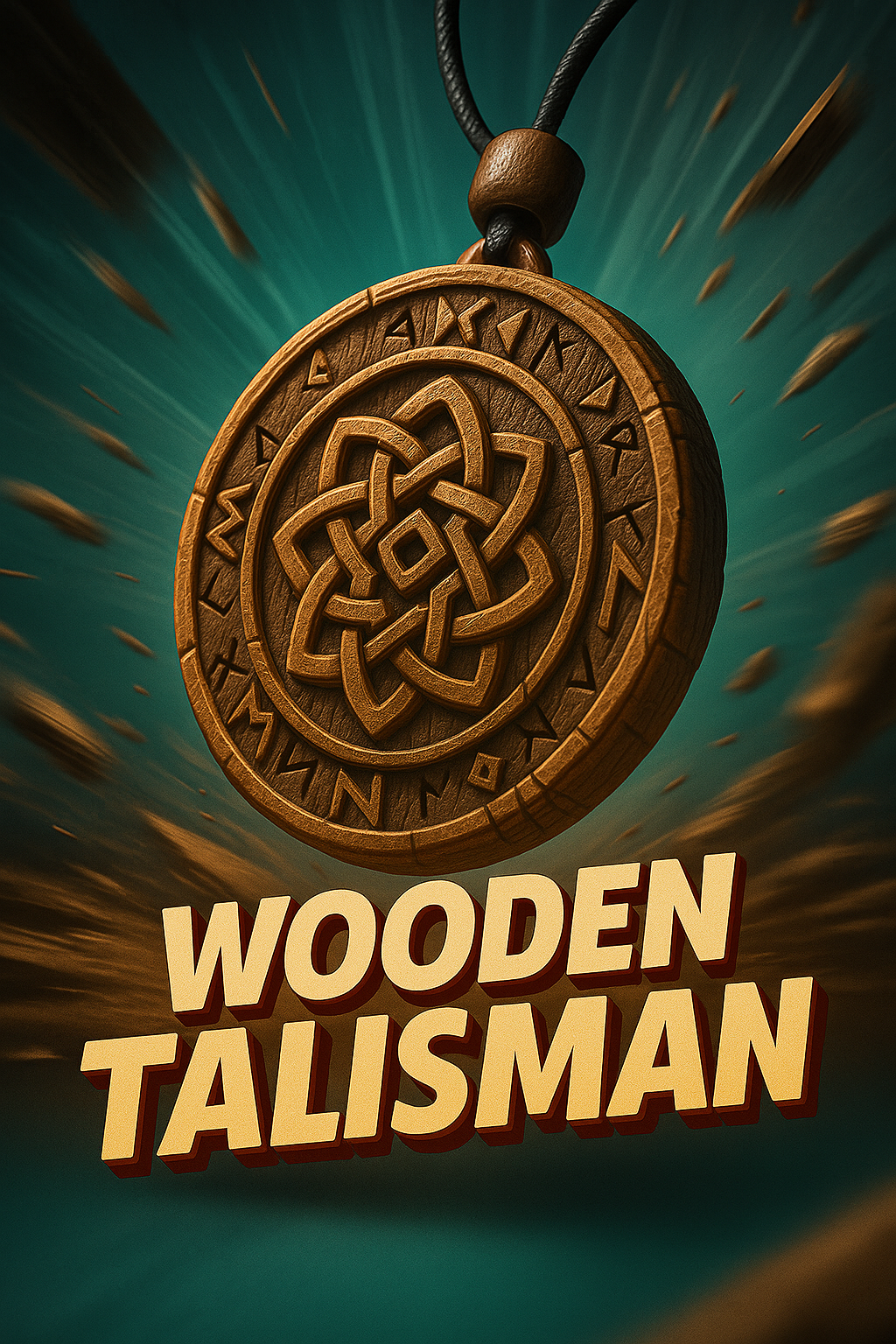 /Collection: /by davooda/Type: PNG/A striking wooden talisman is suspended in mid-air, surrounded by dynamic lines radiating outward. The background features a smooth gradient, enhancing the depth and motion of the scene.
