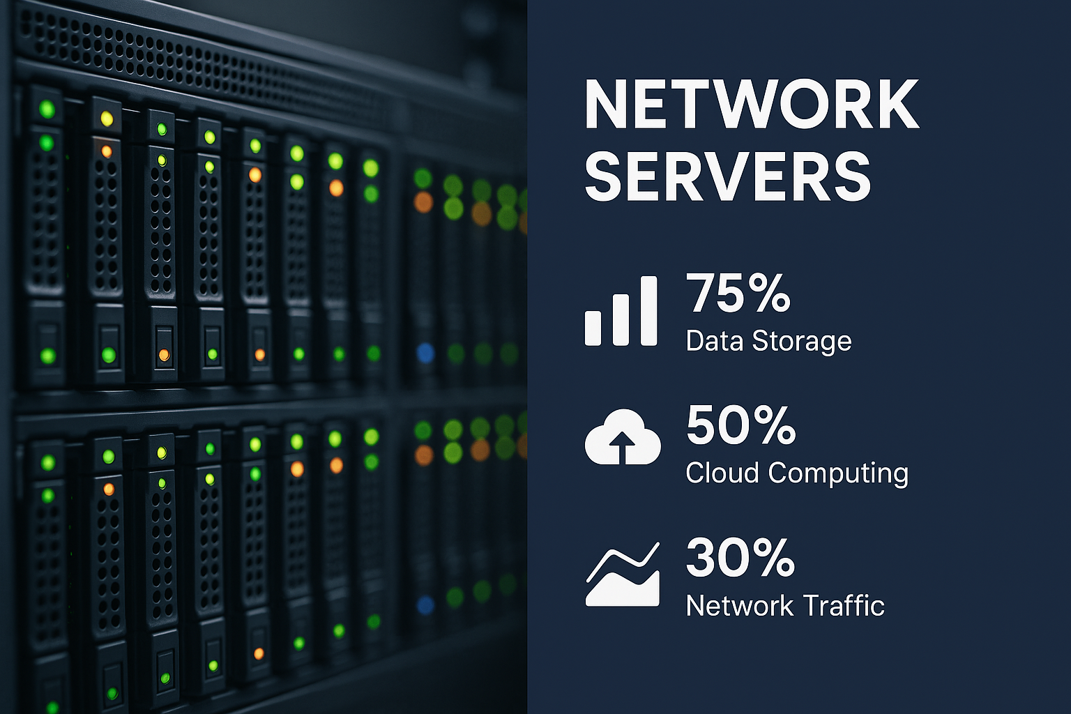 A sleek infographic showcasing key performance metrics for network servers, focusing on data storage, cloud computing, and network traffic. Ideal for tech presentations or educational content.