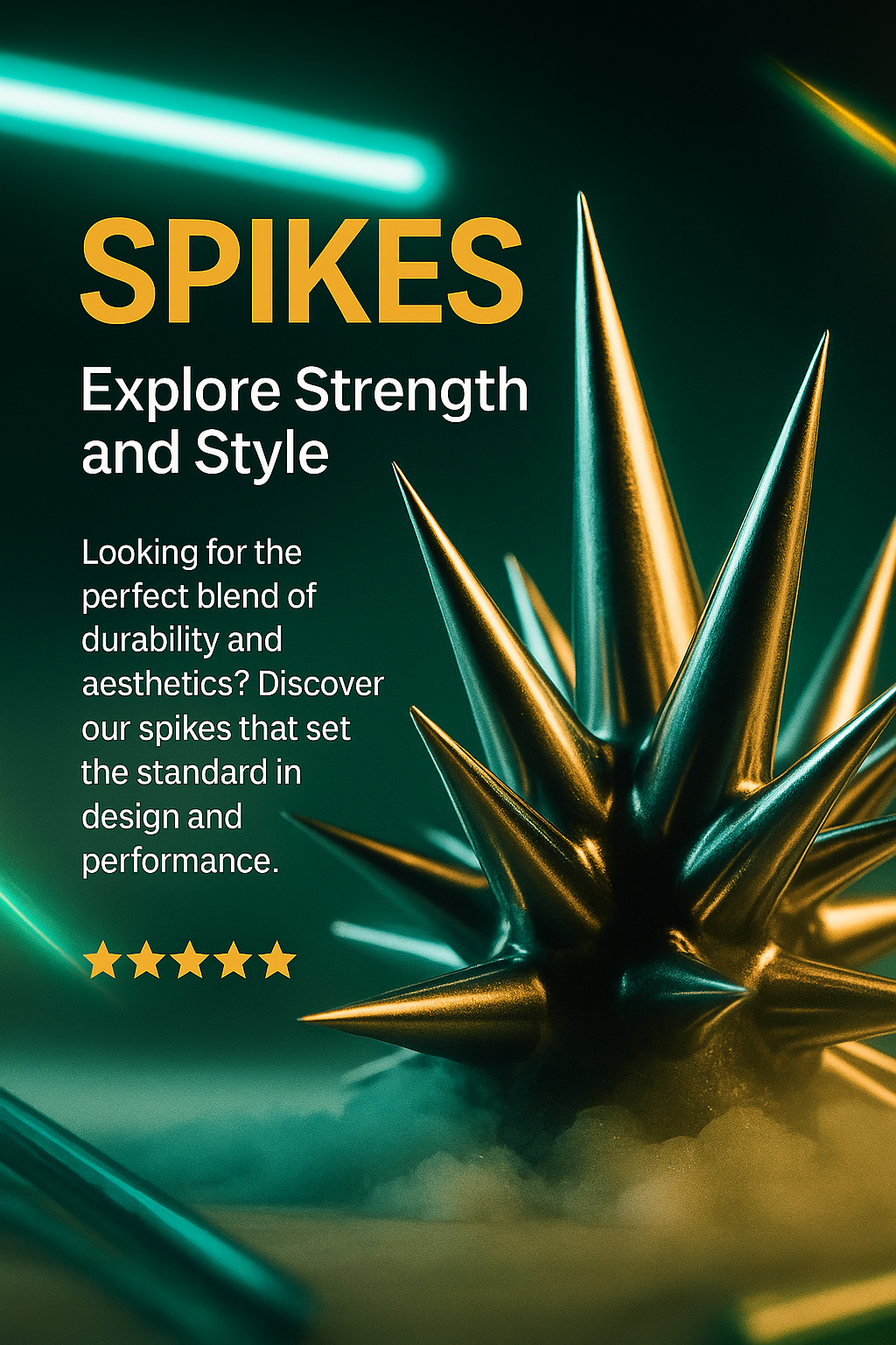 A vibrant carousel slide showcasing spikes with neon accents. The design features layered elements, bold headlines, and a glowing aesthetic, emphasizing strength and style.