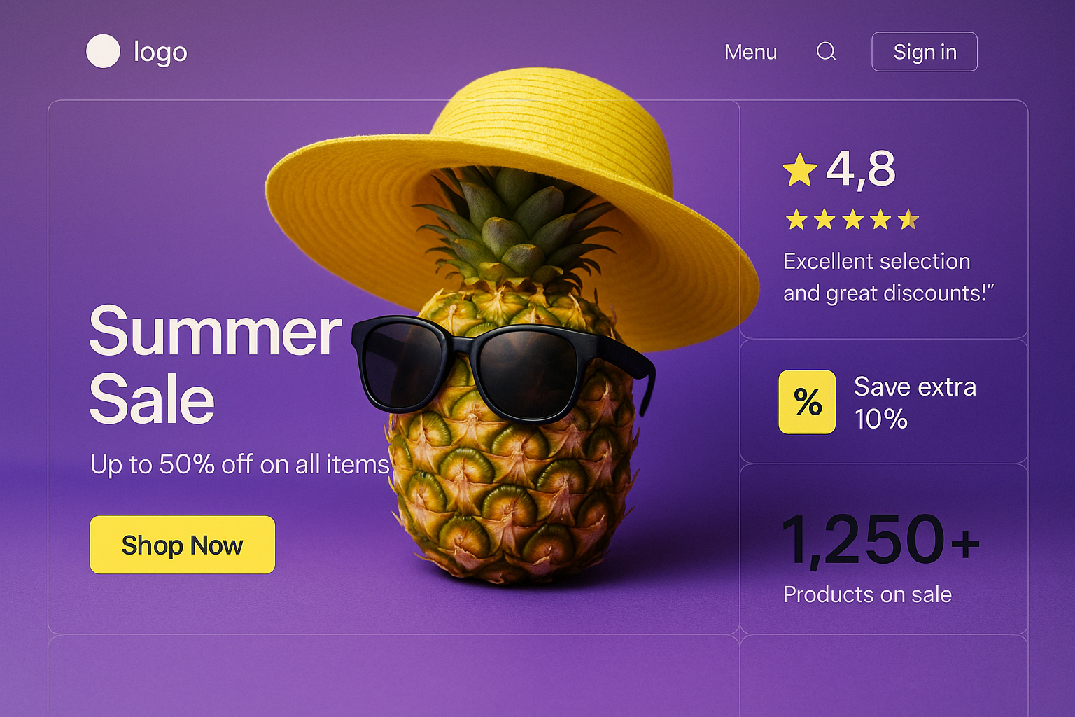 /Collection: /by davooda/Type: PNG/A vibrant landing page mockup featuring a pineapple wearing sunglasses and a hat, promoting a summer sale with bright colors, star ratings, and call-to-action buttons.