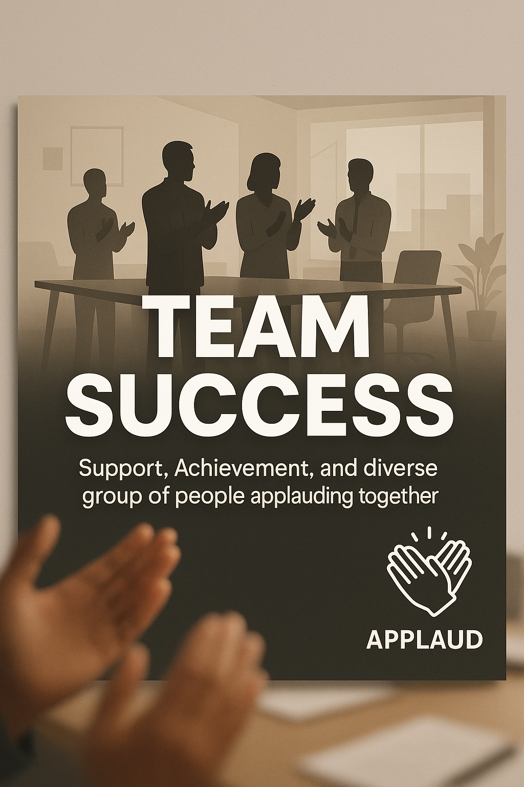Inspirational poster depicting a diverse group of people applauding, symbolizing support and achievement in teamwork. Ideal for motivational settings.