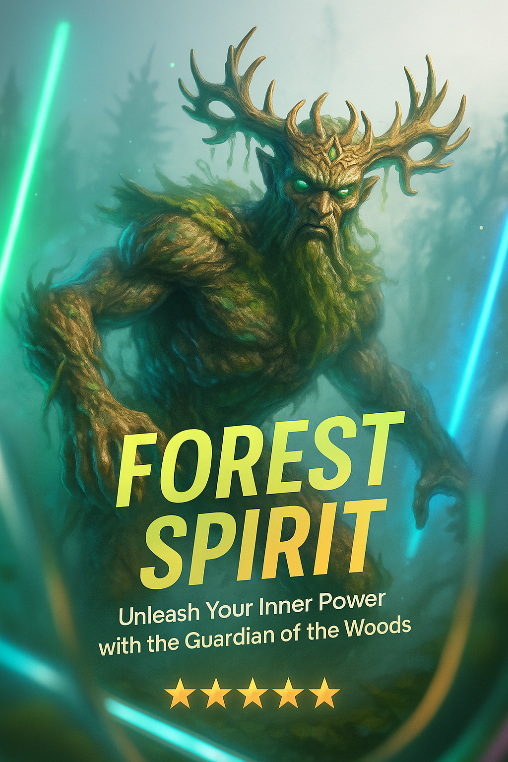 /Collection: /by davooda/Type: PNG/A captivating illustration of a forest spirit surrounded by glowing neon accents in deep greens and warm golds. The text block encourages viewers to connect with nature.