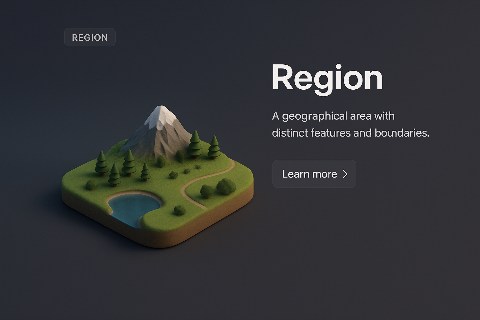 /Collection: /by davooda/Type: PNG/A visually appealing 3D scene depicting a small region with a mountain, trees, and a pond, set against a dark gradient background. The design integrates informative text and a button.