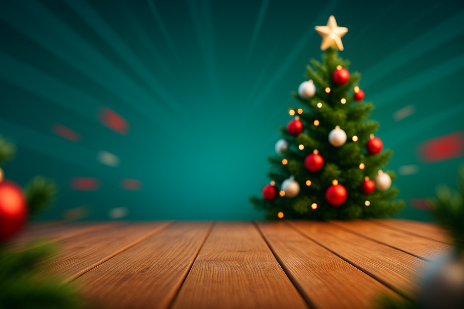 An empty wooden table is set against a vibrant Christmas-themed background featuring a decorated tree. The dynamic composition enhances the festive atmosphere.