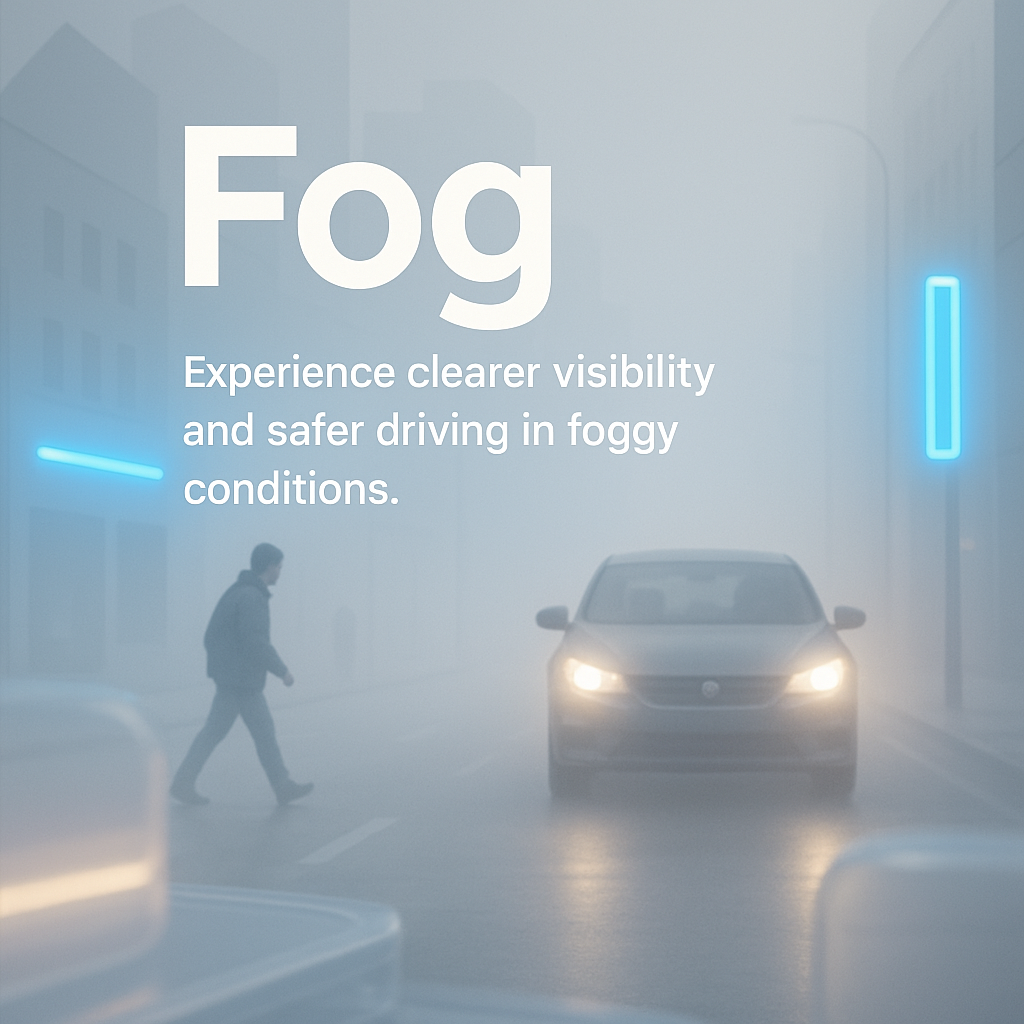 Promotional graphic emphasizing the importance of visibility and safety while driving in fog. The minimalistic design features a foggy urban environment, ideal for educational or awareness campaigns.