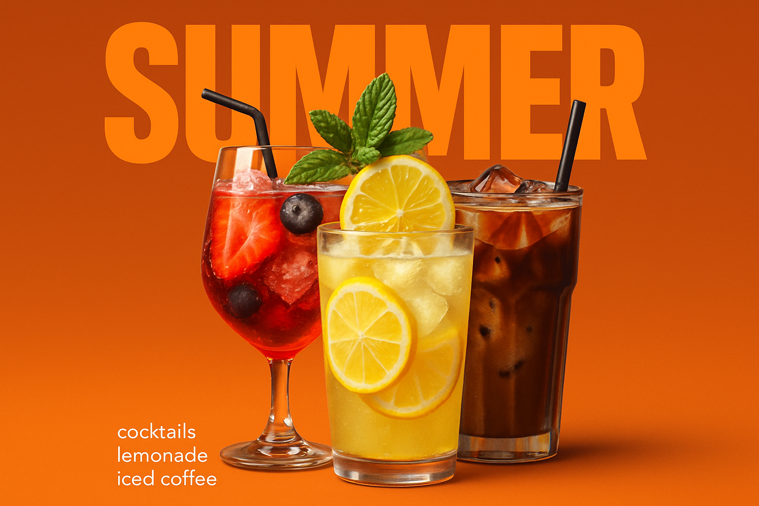 /Collection: /by davooda/Type: PNG/A vibrant display of summer beverages including cocktails, lemonade, and iced coffee. The drinks are detailed and realistic, set against a bold orange gradient background with a massive 'SUMMER' headline.
