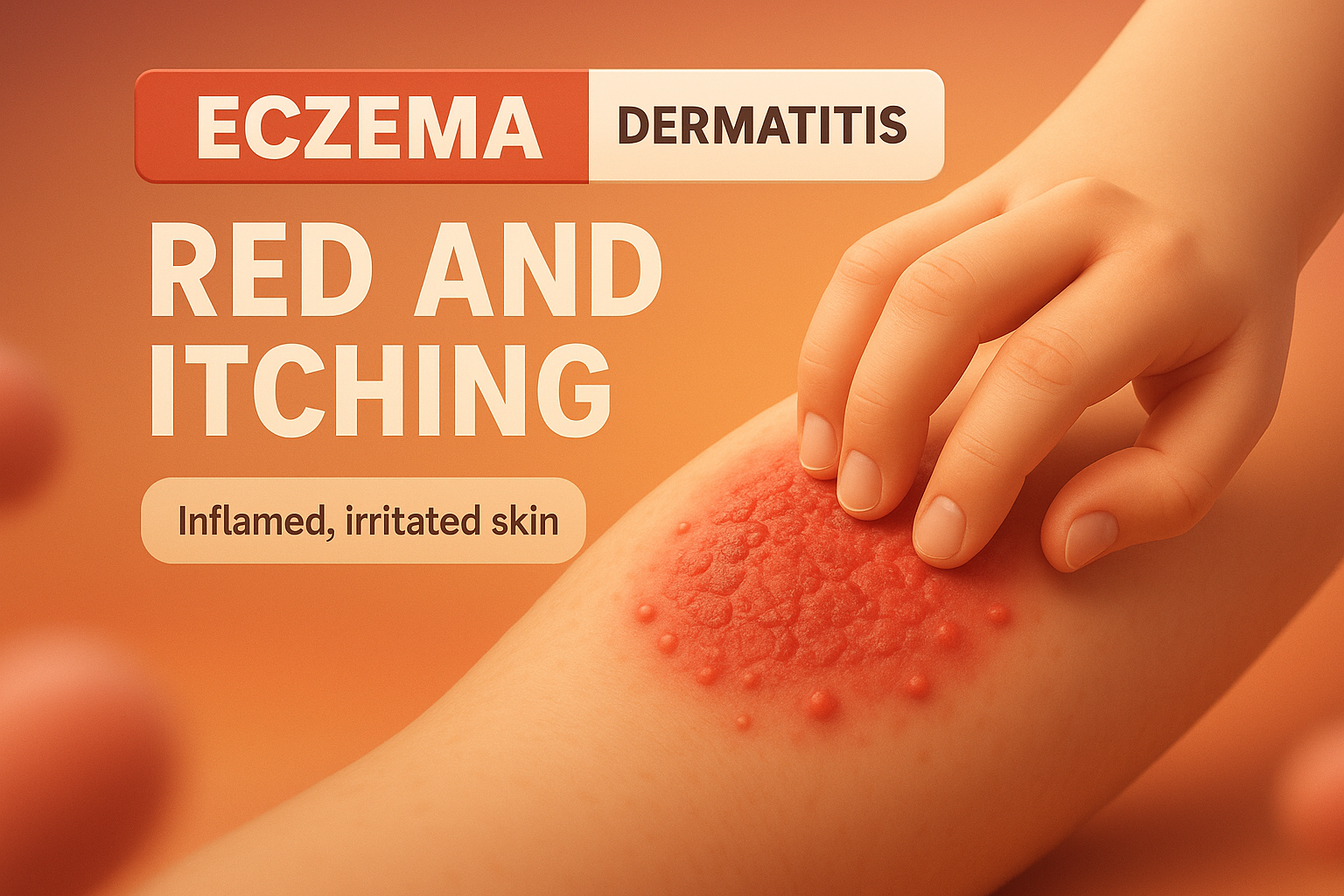 A visually engaging illustration depicting eczema symptoms, featuring a hand touching inflamed skin. Ideal for educational materials on skin conditions.