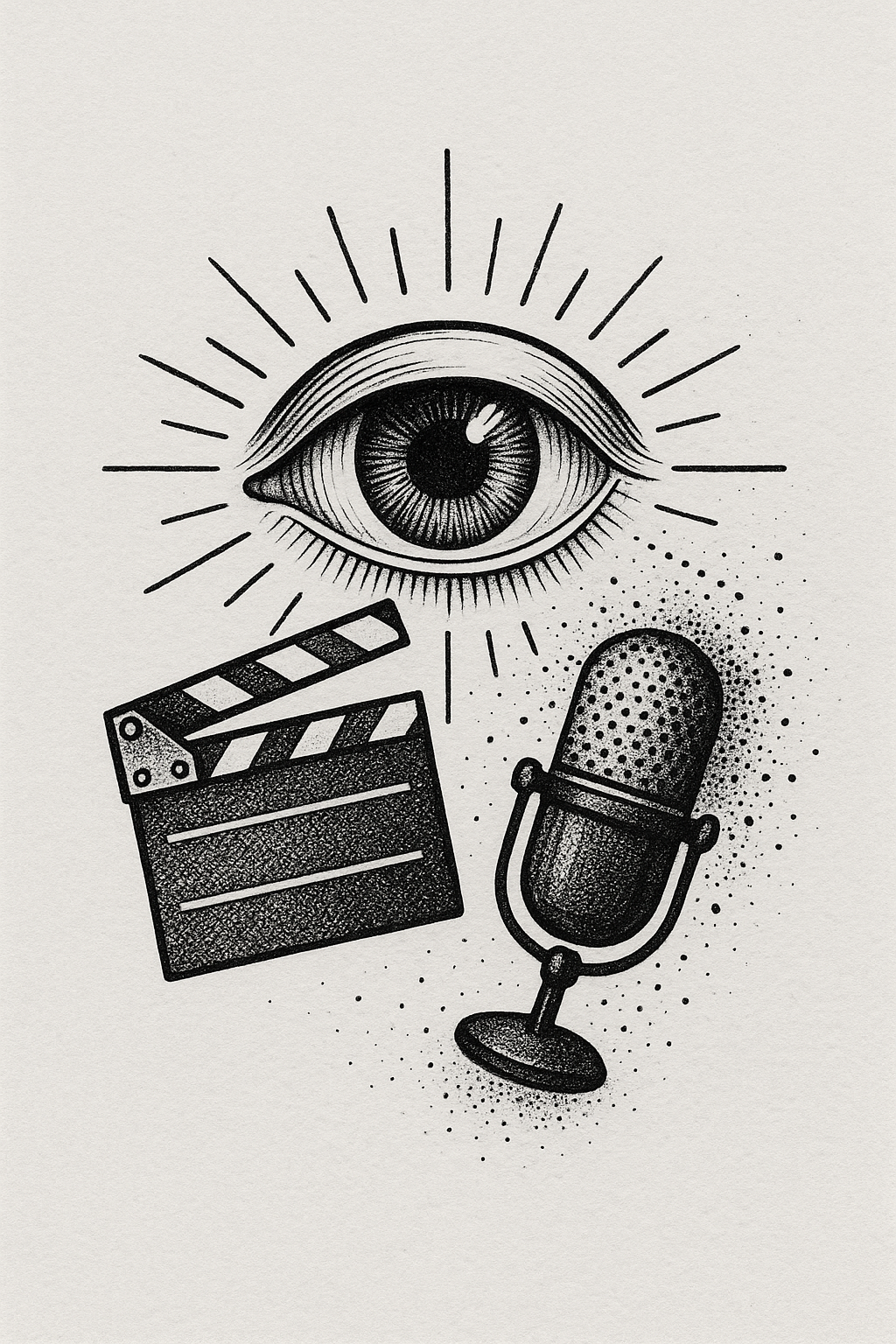 /Collection: /by davooda/Type: PNG/This image features a stylized design combining an eye, film clapperboard, and microphone. It's suitable for creative projects related to media and entertainment.