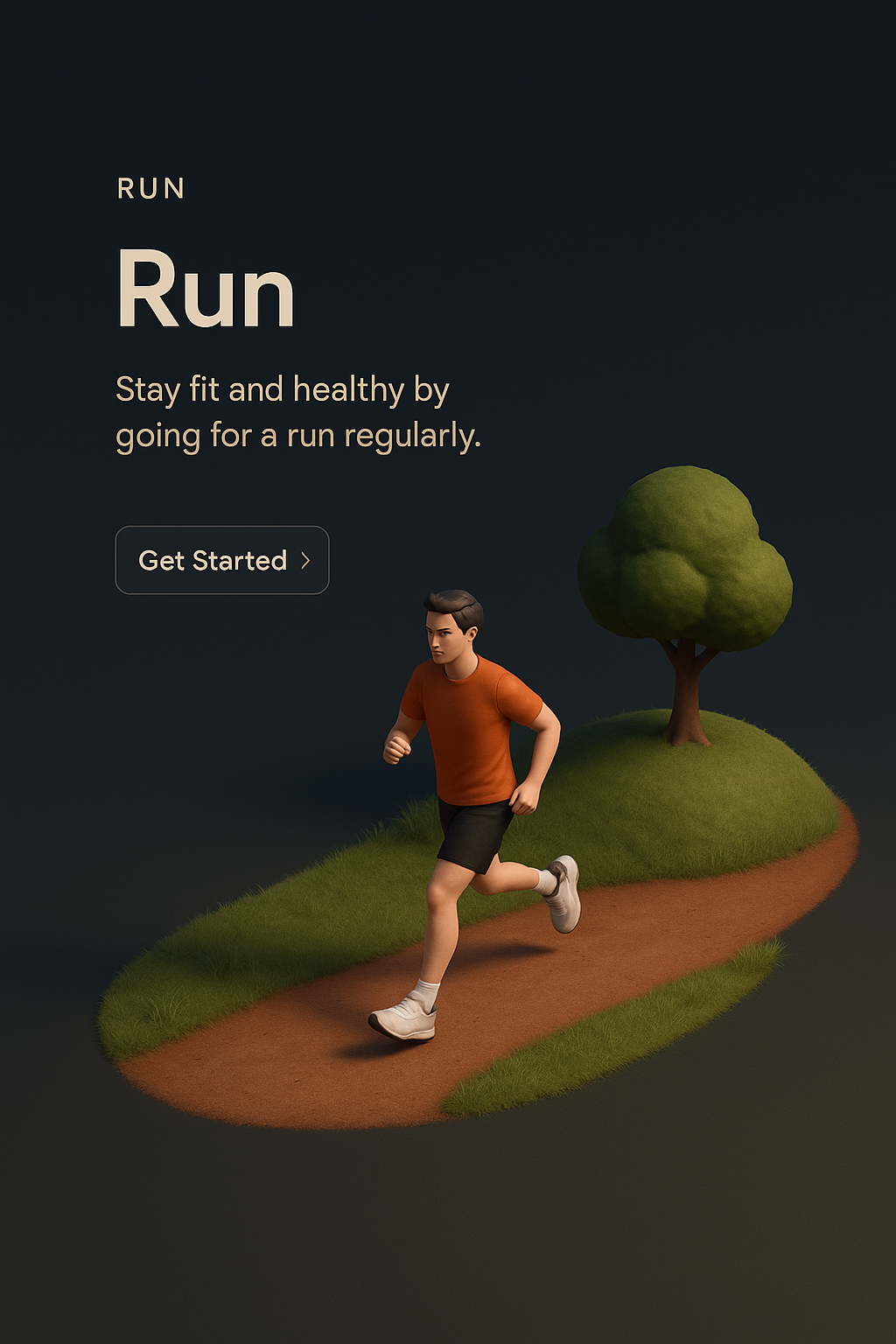A detailed 3D scene depicting a runner on a path within a dark gradient background, showcasing a healthy lifestyle. The scene includes a tree and a clickable action button.
