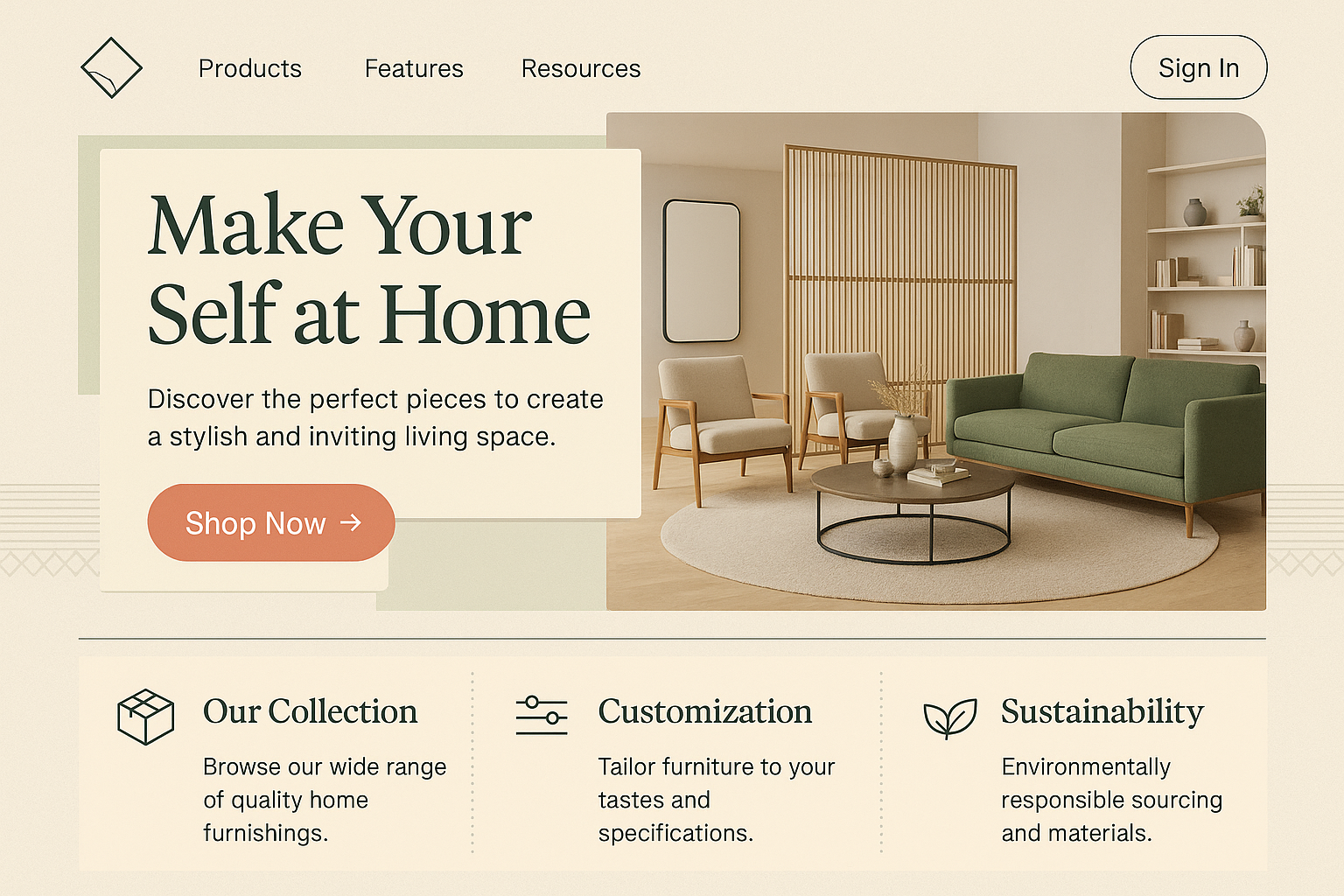 A visually appealing landing page design in boho style featuring a modern living room. Includes sections for products, features, and a call-to-action button.