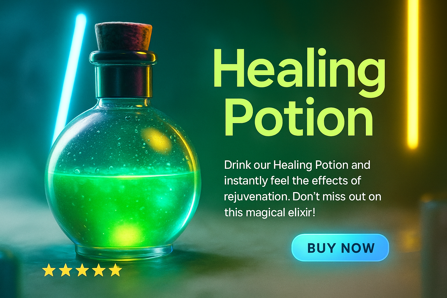 A visually striking promotional slide featuring a glowing healing potion. The design includes neon accents, deep greens, and warm golds, creating a mystical ambiance.