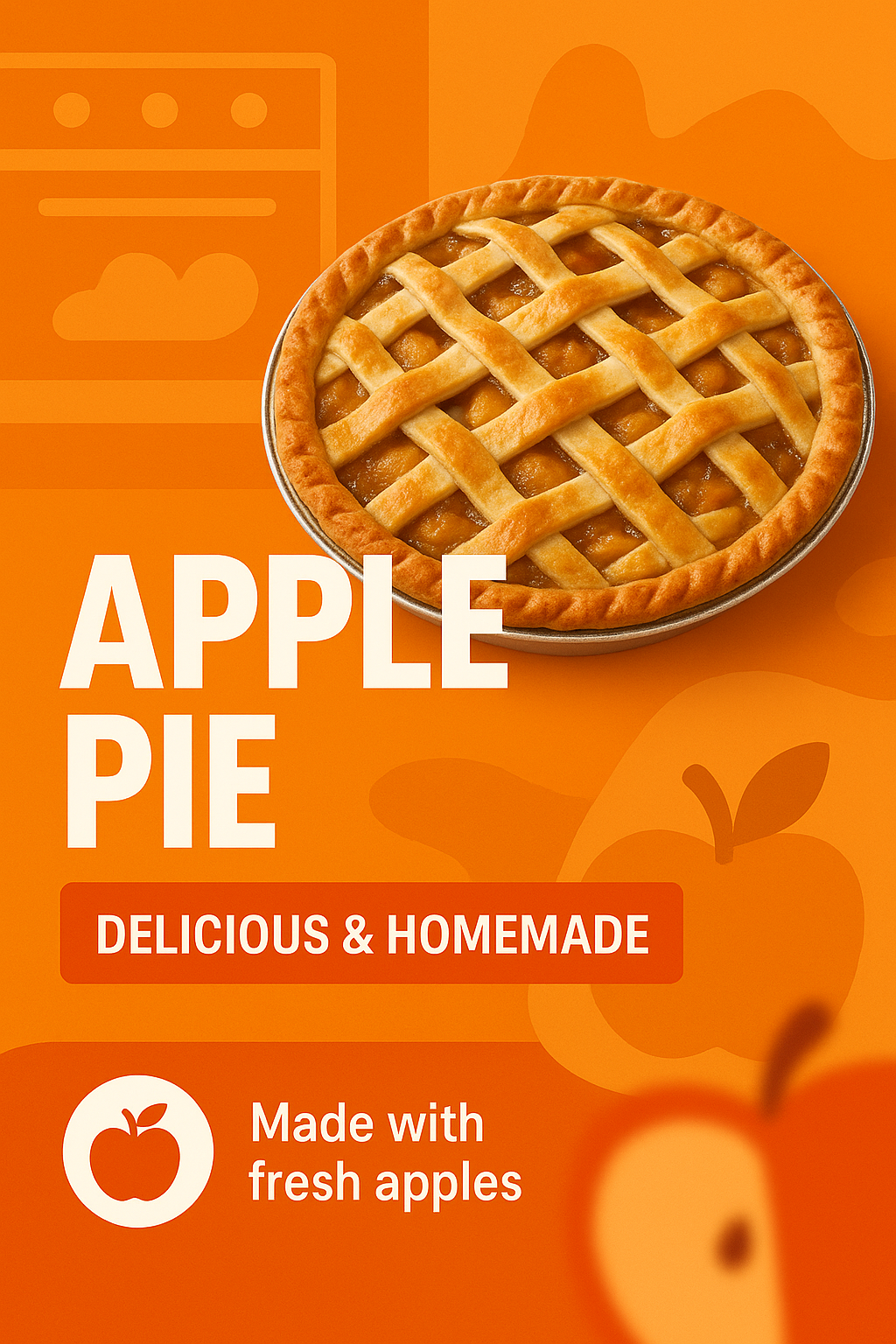 Vibrant promotional graphic featuring a freshly baked apple pie, emphasizing homemade quality with warm colors and inviting design elements, ideal for food marketing.