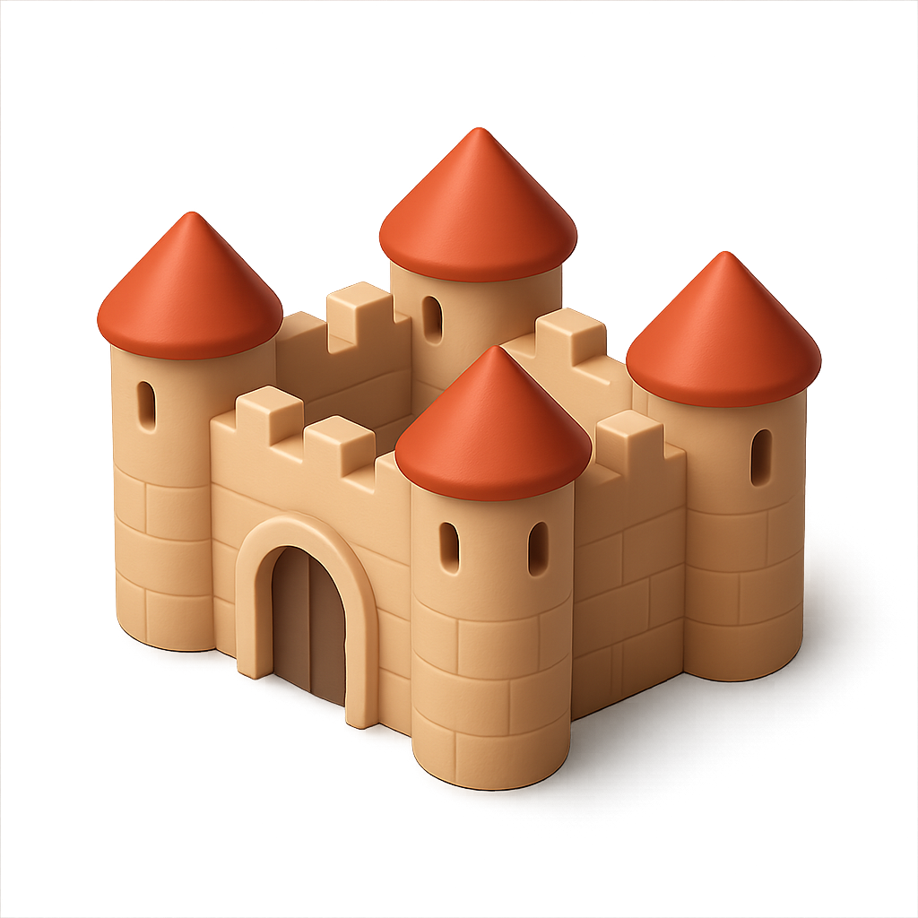 A vibrant 3D icon of a fortress featuring rounded towers and conical roofs, designed with a playful, cartoonish style. The fortress is set against a soft background.