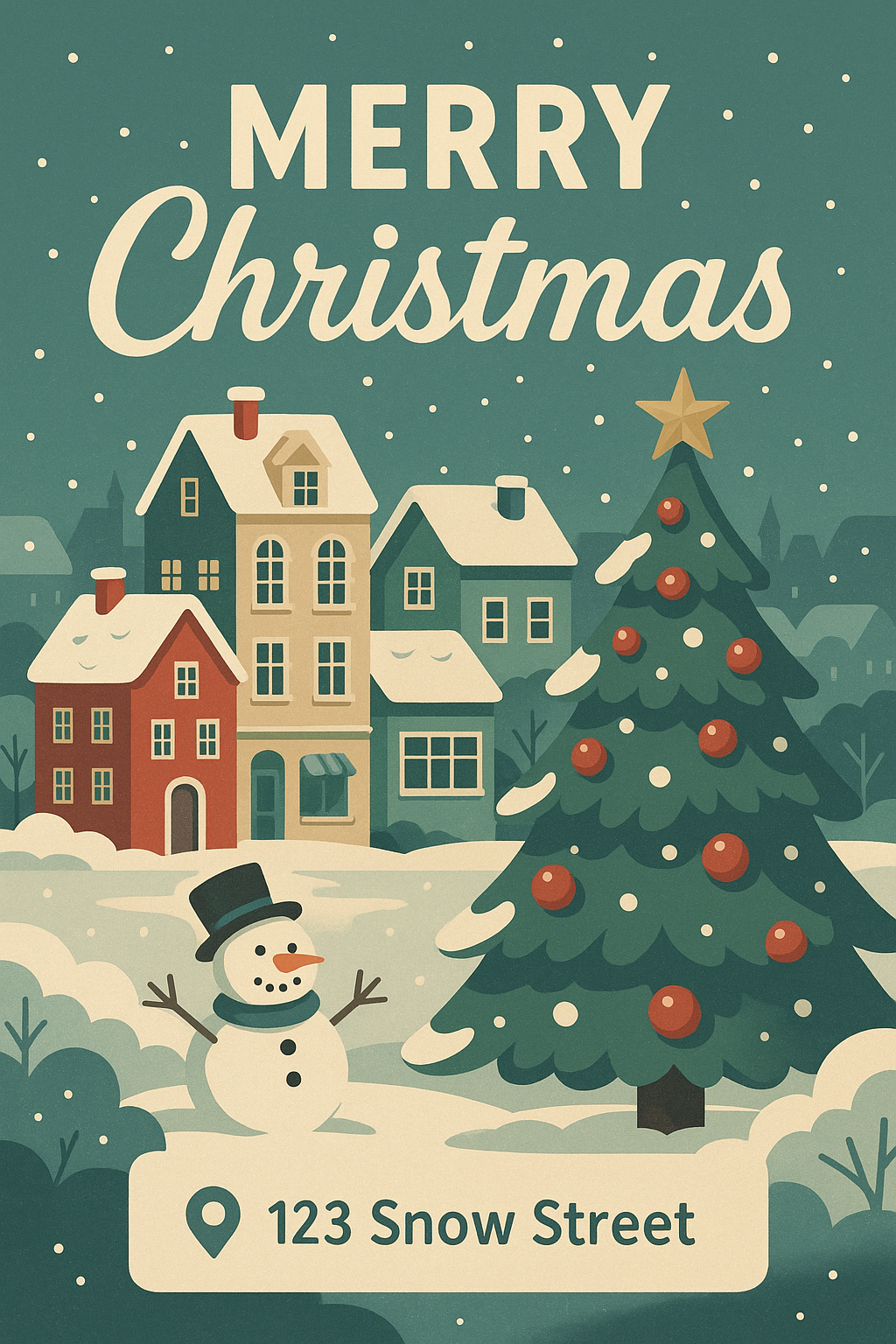/Collection: /by davooda/Type: PNG/Charming holiday greeting card illustration featuring a snowy village scene, a decorated Christmas tree, and a cheerful snowman, perfect for seasonal greetings.