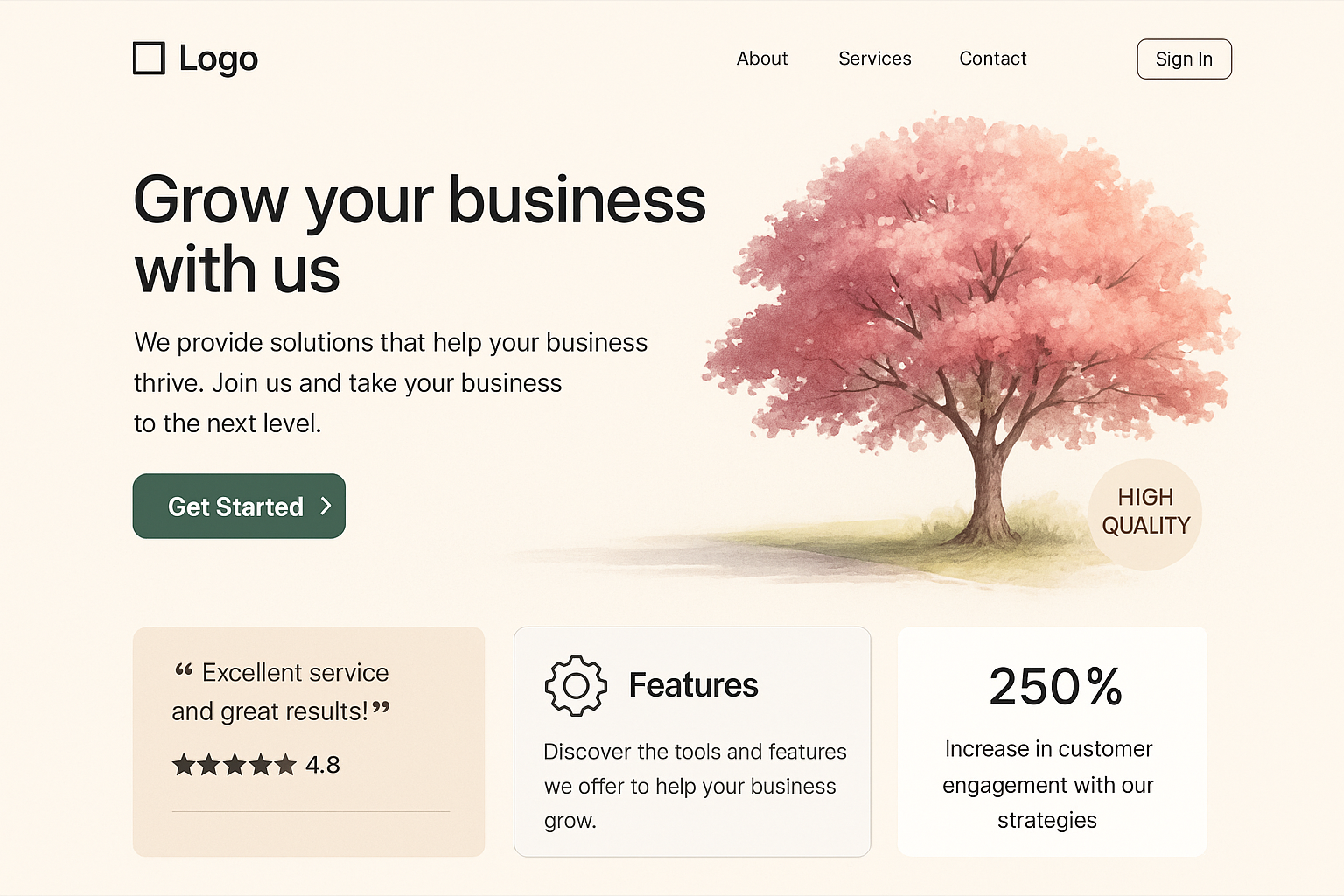 /Collection: /by davooda/Type: PNG/A landing page layout featuring a blooming tree, an engaging tagline, and sections for testimonials, features, and performance metrics. Designed for clarity and professional appeal.