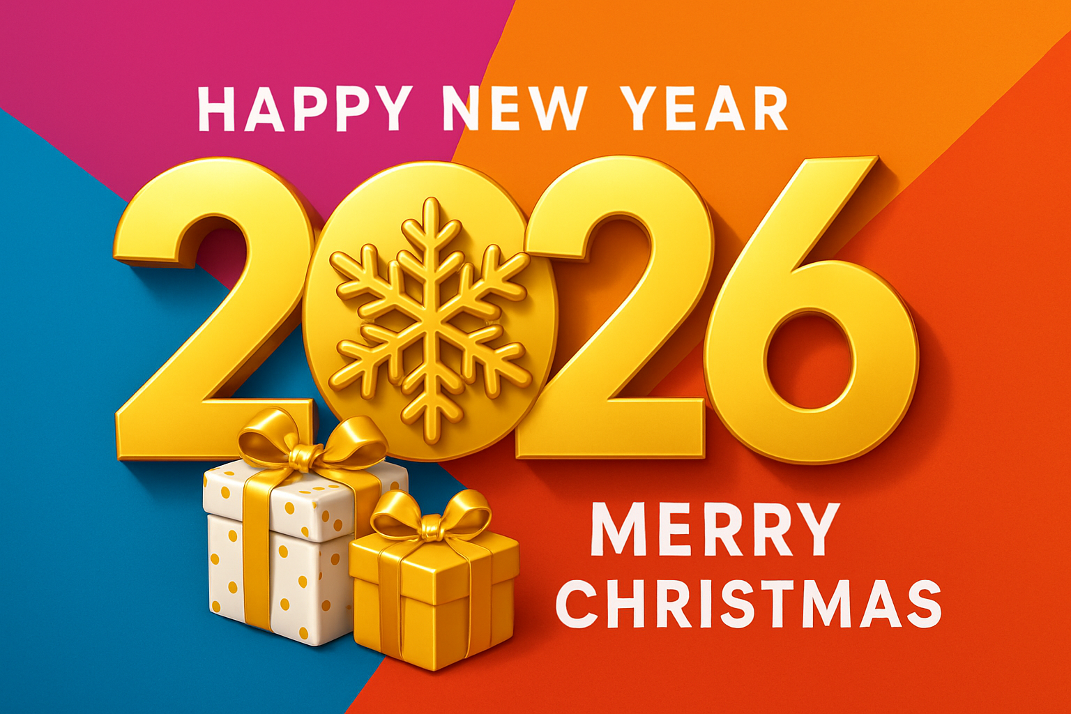/Collection: /by davooda/Type: PNG/A festive greeting card for 2026 featuring bold golden numbers, a snowflake, and gift boxes. The vibrant background showcases bright colors, enhancing the energetic mood.