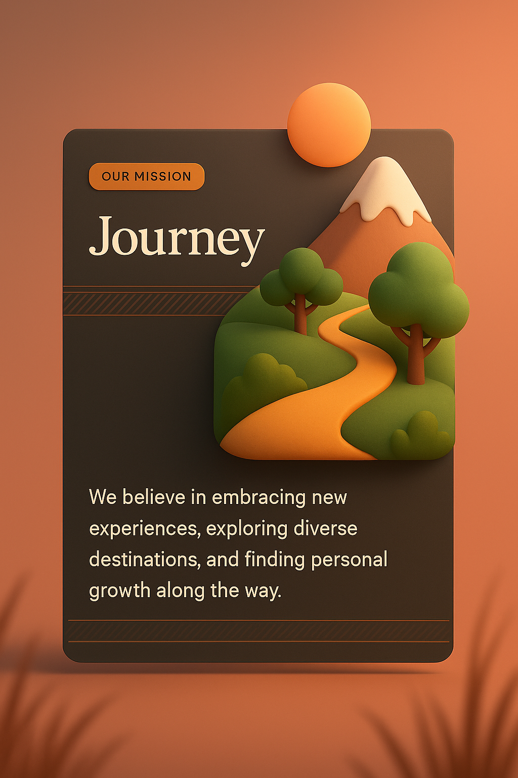 A captivating 3D design illustrating a journey with a winding path, mountains, and trees, integrated into a dark panel. The scene emphasizes exploration and personal growth.