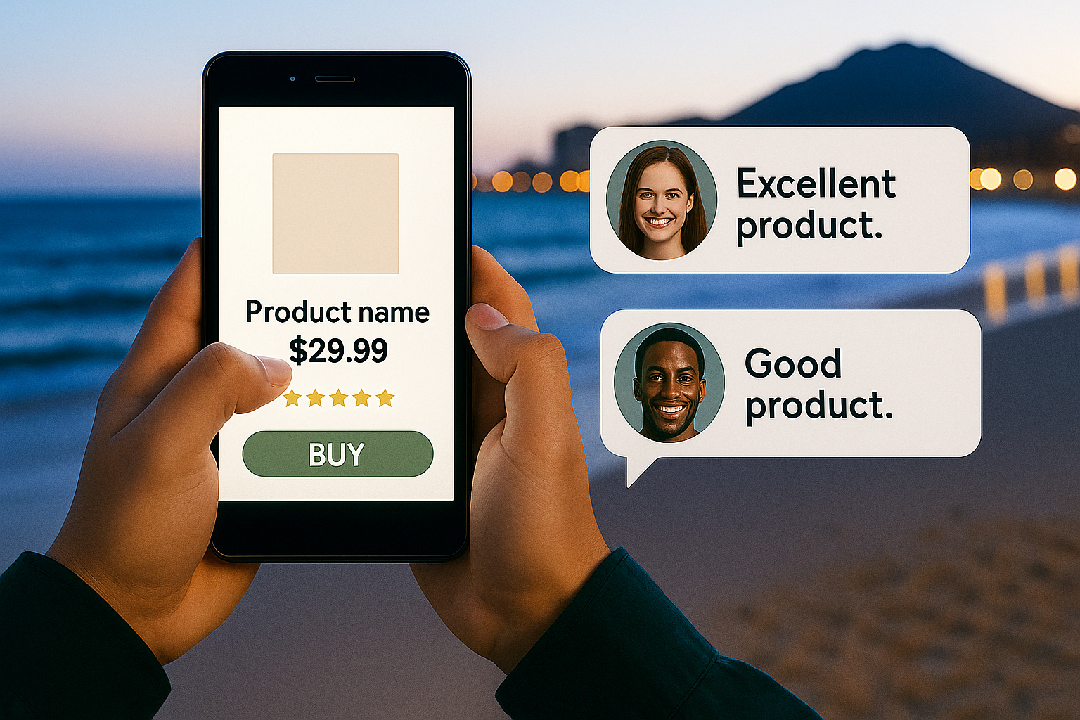 Social media graphic showcasing a smartphone displaying a product with user reviews. Ideal for promoting e-commerce products and engaging potential buyers.