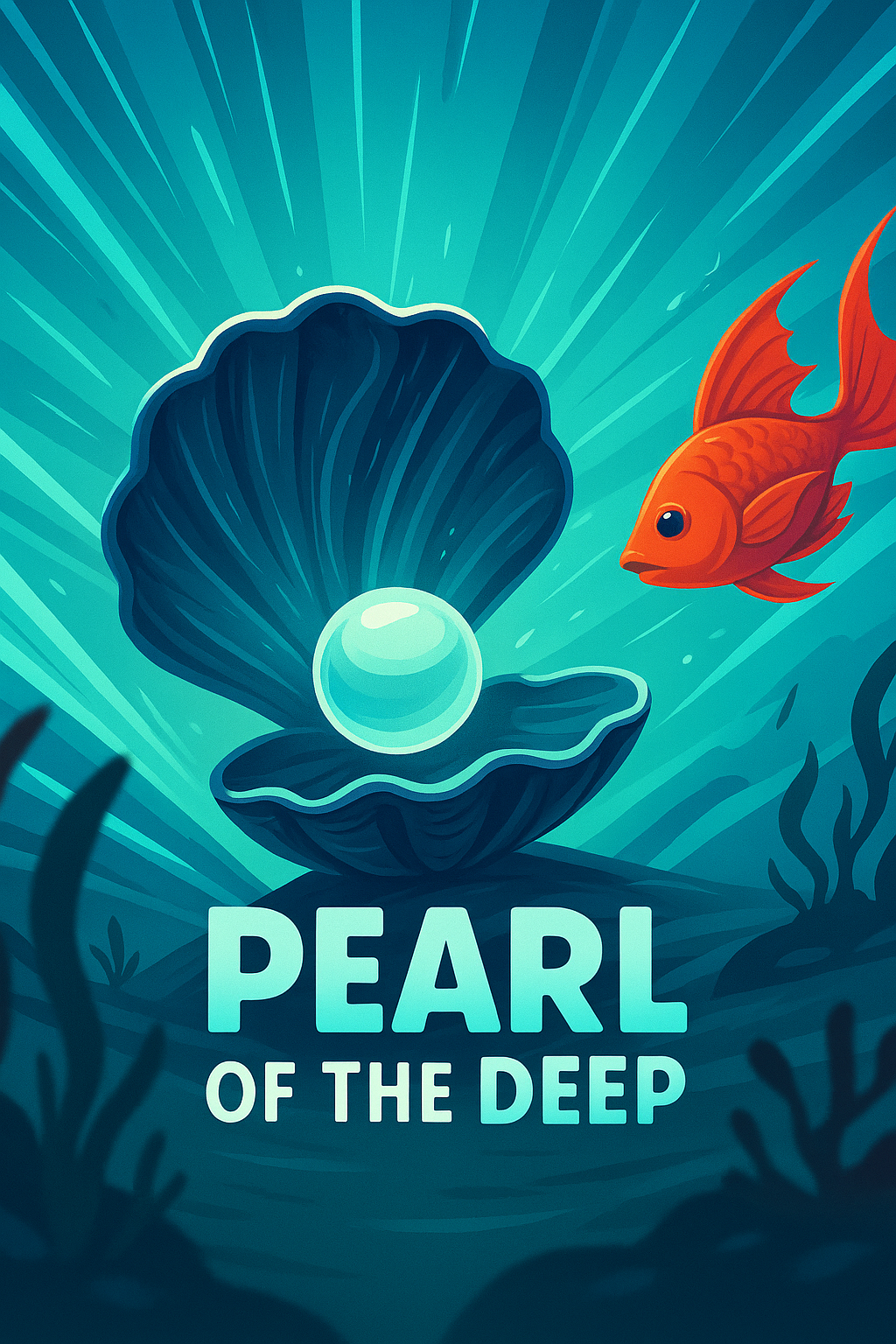 A striking illustration of a pearl within an open shell, surrounded by dynamic aquatic elements. The background features a smooth gradient with rays emanating from the center, enhancing the underwater theme.