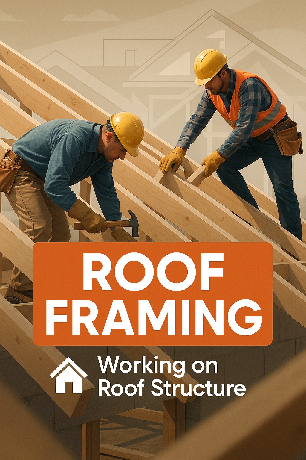 Dynamic construction image depicting workers framing a roof structure, with a focus on teamwork and craftsmanship. Ideal for construction industry promotions.
