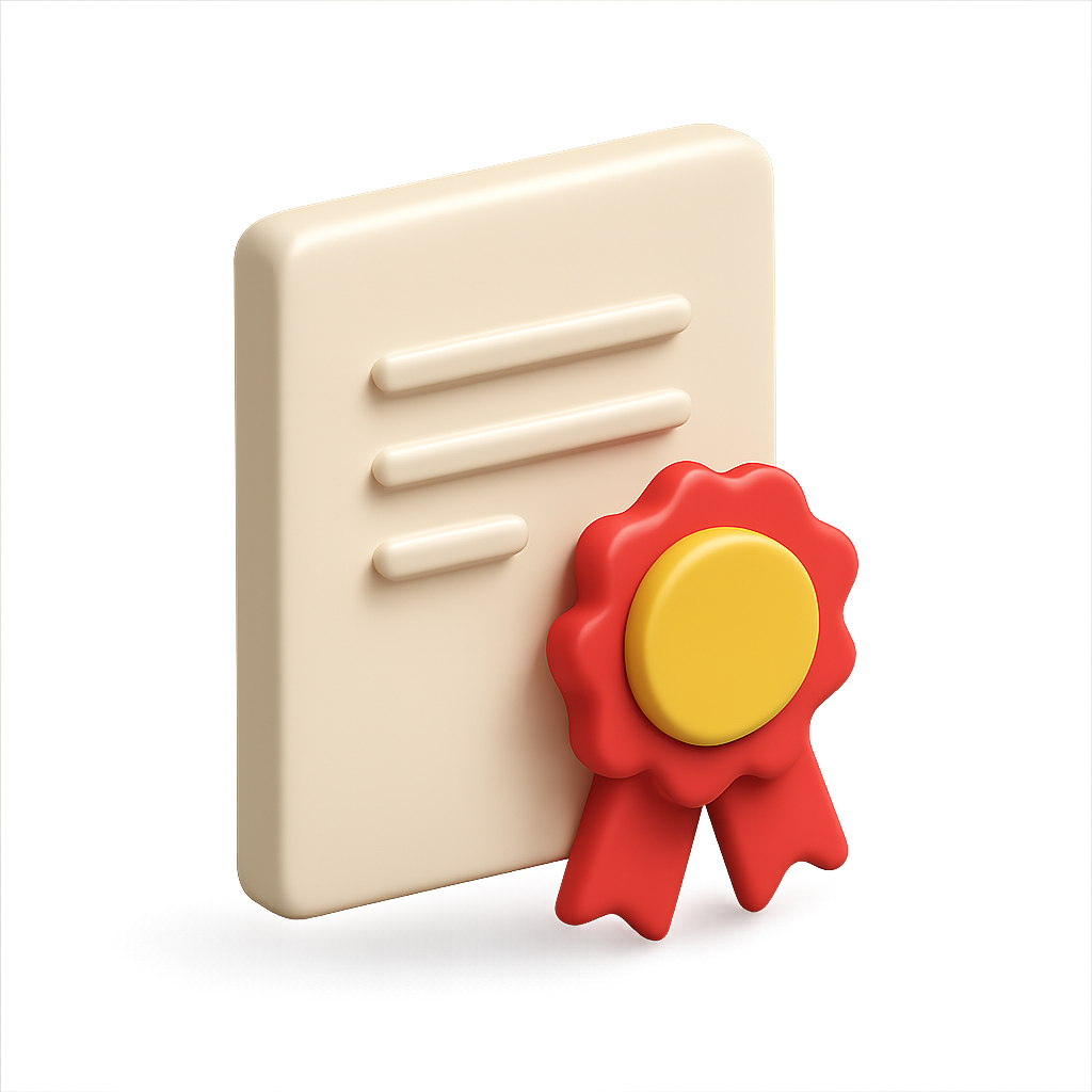/Collection: /by davooda/Type: PNG/This image features a 3D certificate icon, designed with a simple badge. The certificate is cream-colored with embossed lines, accompanied by a vibrant red and yellow ribbon badge, all set against a soft background.
