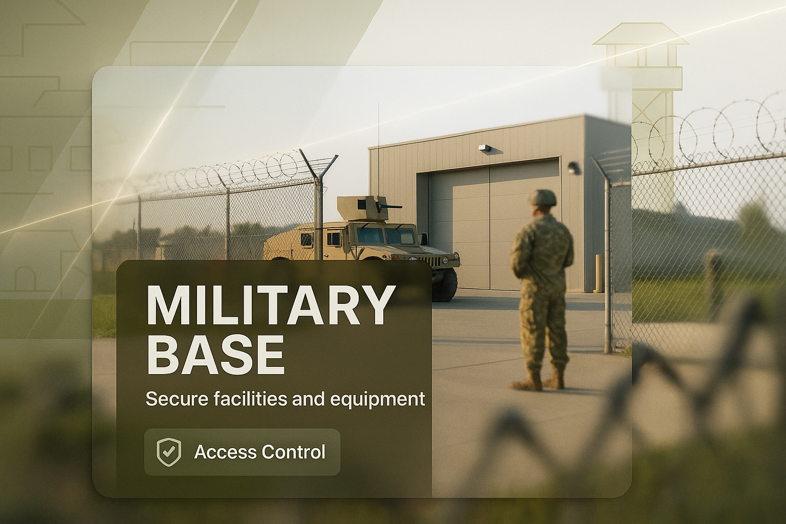 Digital illustration showcasing a military base with a soldier, vehicle, and security features, ideal for defense and security presentations.