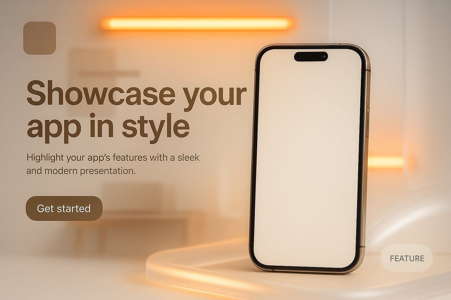 /Collection: /by davooda/Type: PNG/A sleek and modern landing page design featuring a blank phone mockup, set against a soft, glowing background with neon accents. The layout emphasizes small text and a minimalist aesthetic.