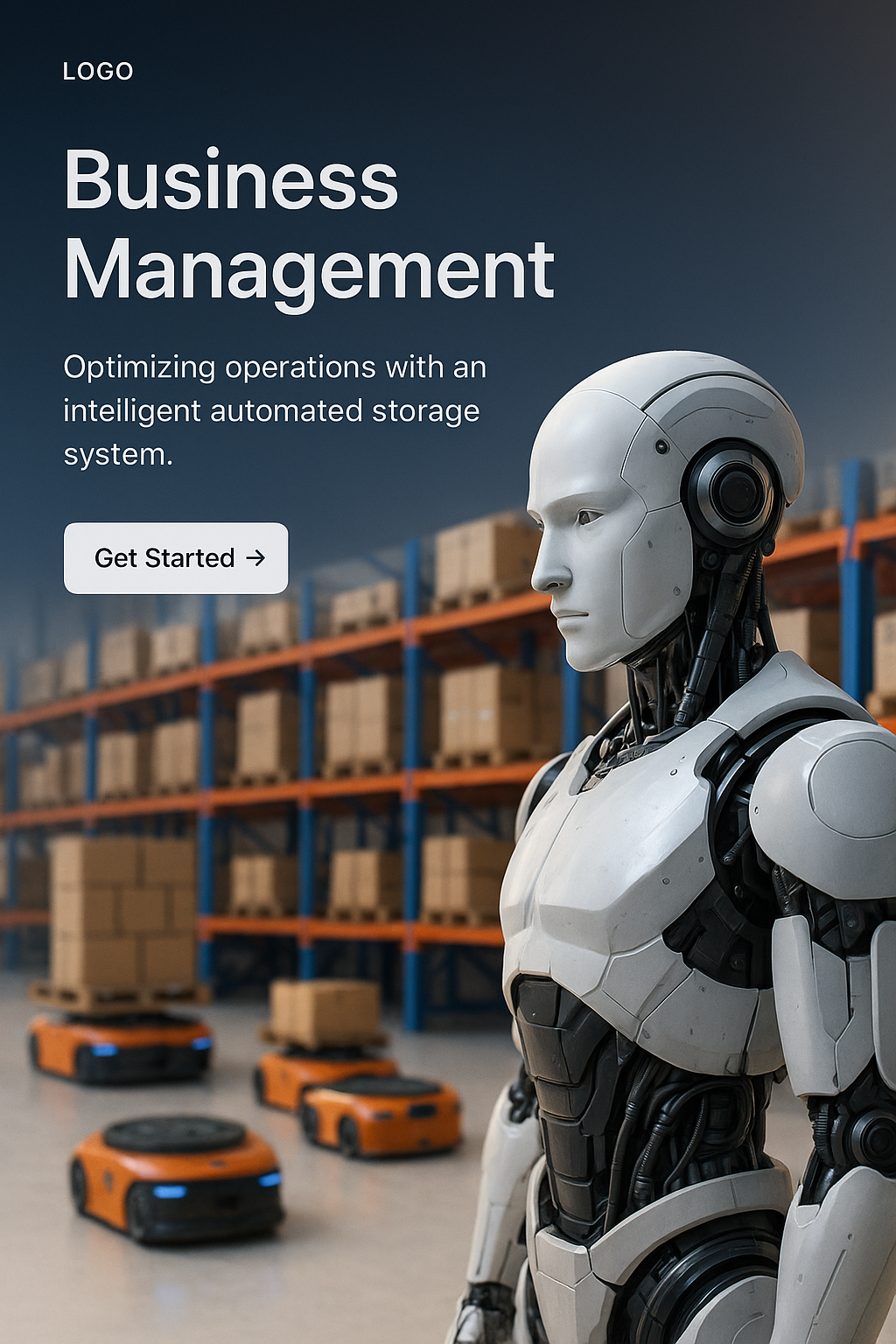 A futuristic robotic warehouse scene featuring a humanoid robot and automated storage systems. The design includes a sleek logo and a call-to-action button for business management.