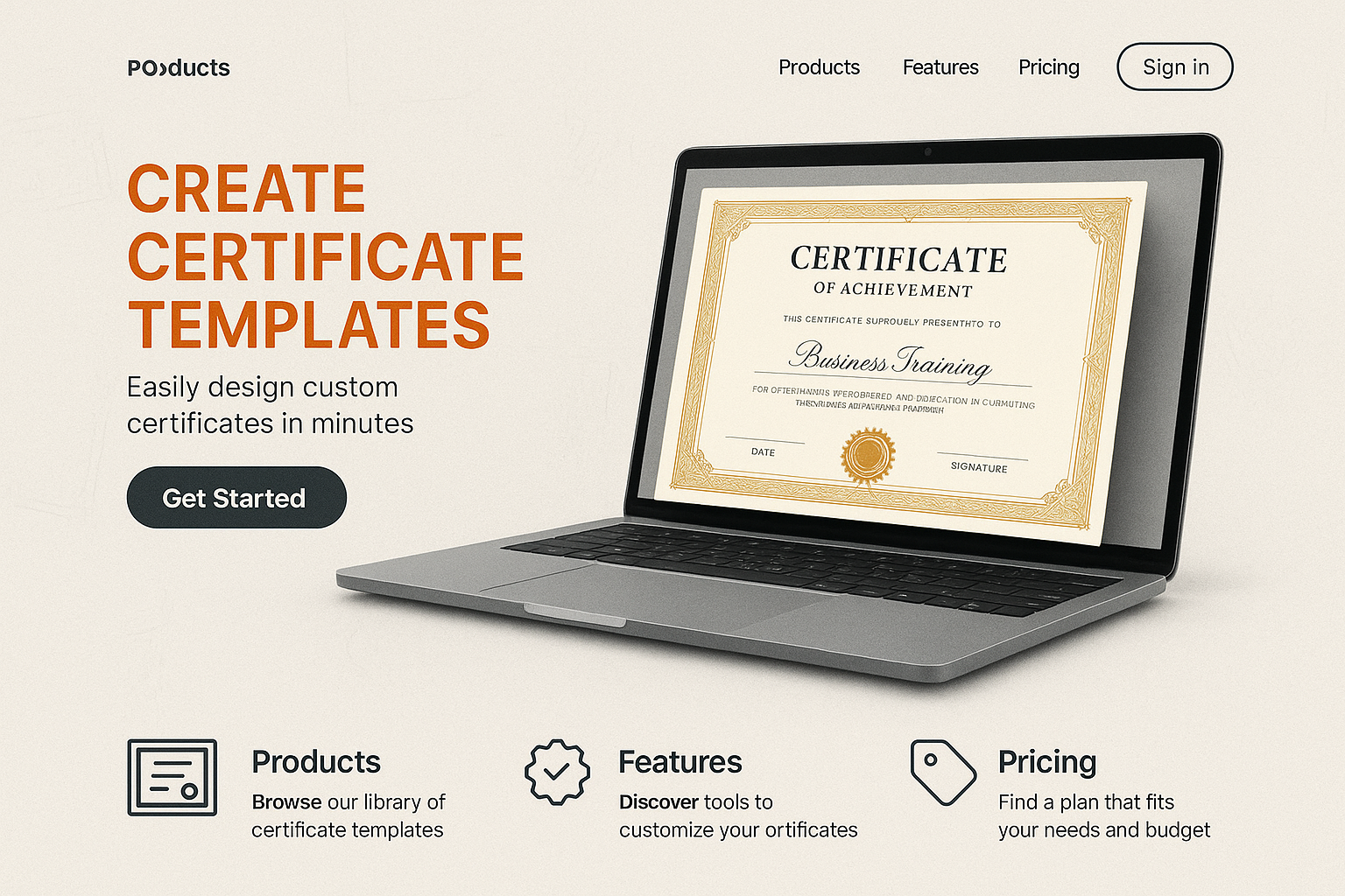 /Collection: /by davooda/Type: PNG/A sleek landing page design showcasing certificate templates on a laptop. Features bold typography, a soft textured background, and a balanced layout for user engagement.