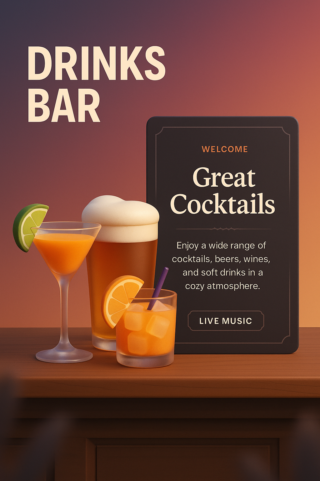 A visually appealing 3D illustration of a drinks bar featuring cocktails and a beer on a wooden countertop, with a stylish welcome sign. The design emphasizes a cozy atmosphere.