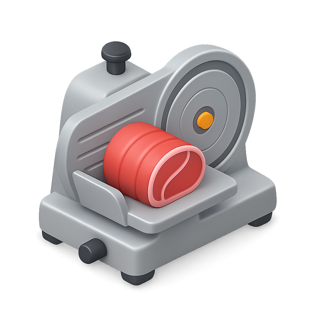 /Collection: /by davooda/Type: PNG/A stylized 3D icon of a meat slicer machine, viewed from a three-quarter angle. The design features a sliced meat section and a sleek, modern look with a transparent background.