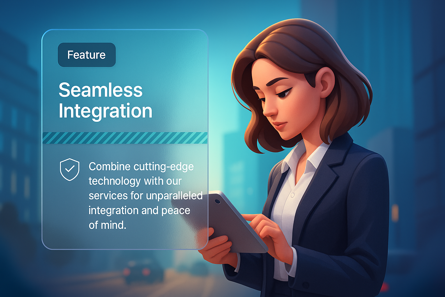 /Collection: /by davooda/Type: PNG/A young, attractive businesswoman stands on a city street, focused on her tablet. The background features a smooth gradient with modern buildings, emphasizing her professional demeanor.