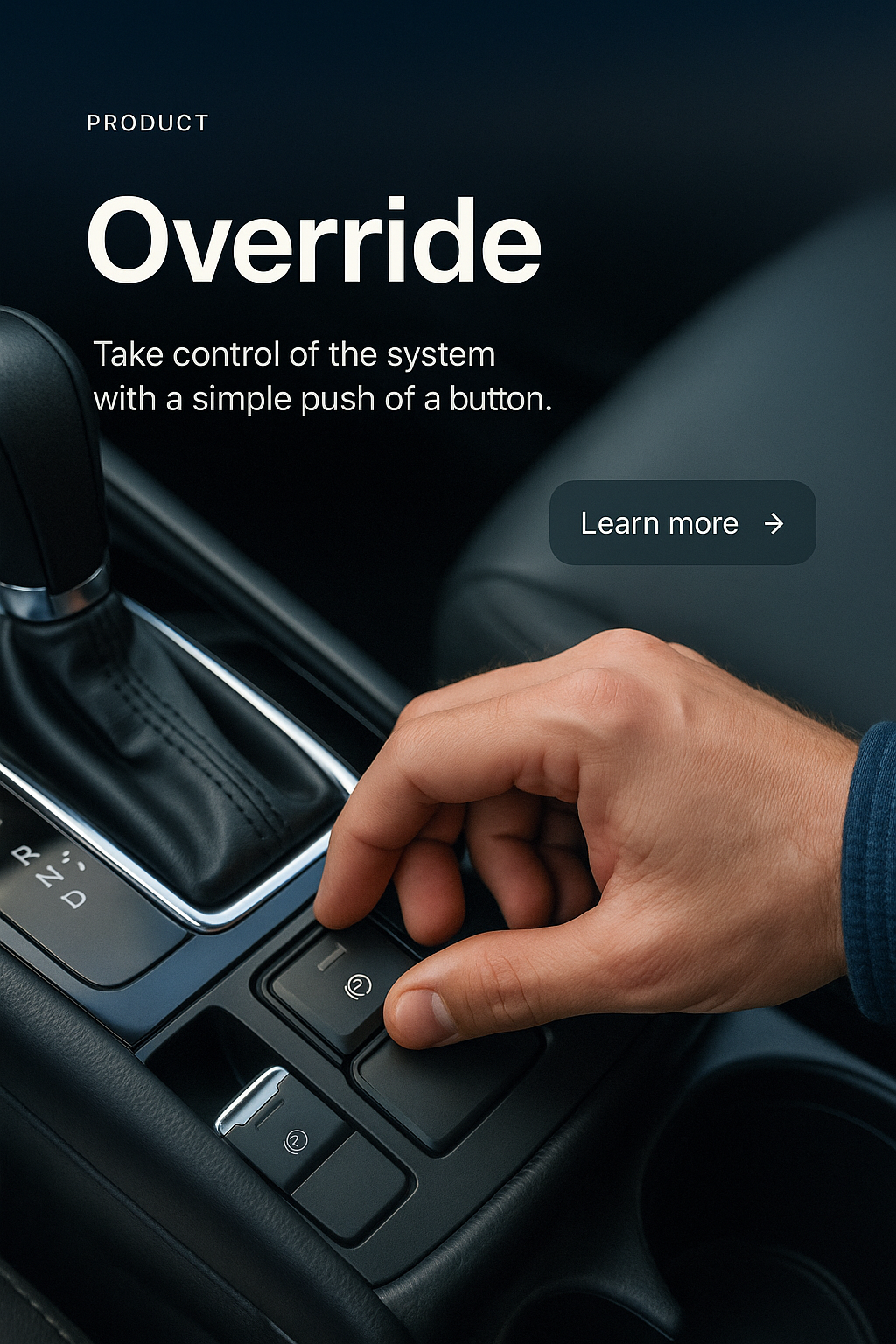 A high-resolution web interface showcasing a hand interacting with a sleek control button for the Override system in a modern car. The design features a gradient background and clear readability.