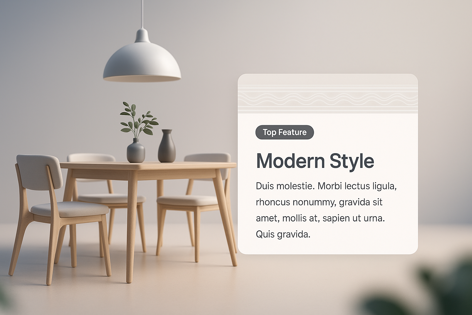 /Collection: /by davooda/Type: PNG/A stylish modern dining room featuring a minimalist design. The space includes a wooden table, chairs, and a pendant light, with a copy space for text integration.
