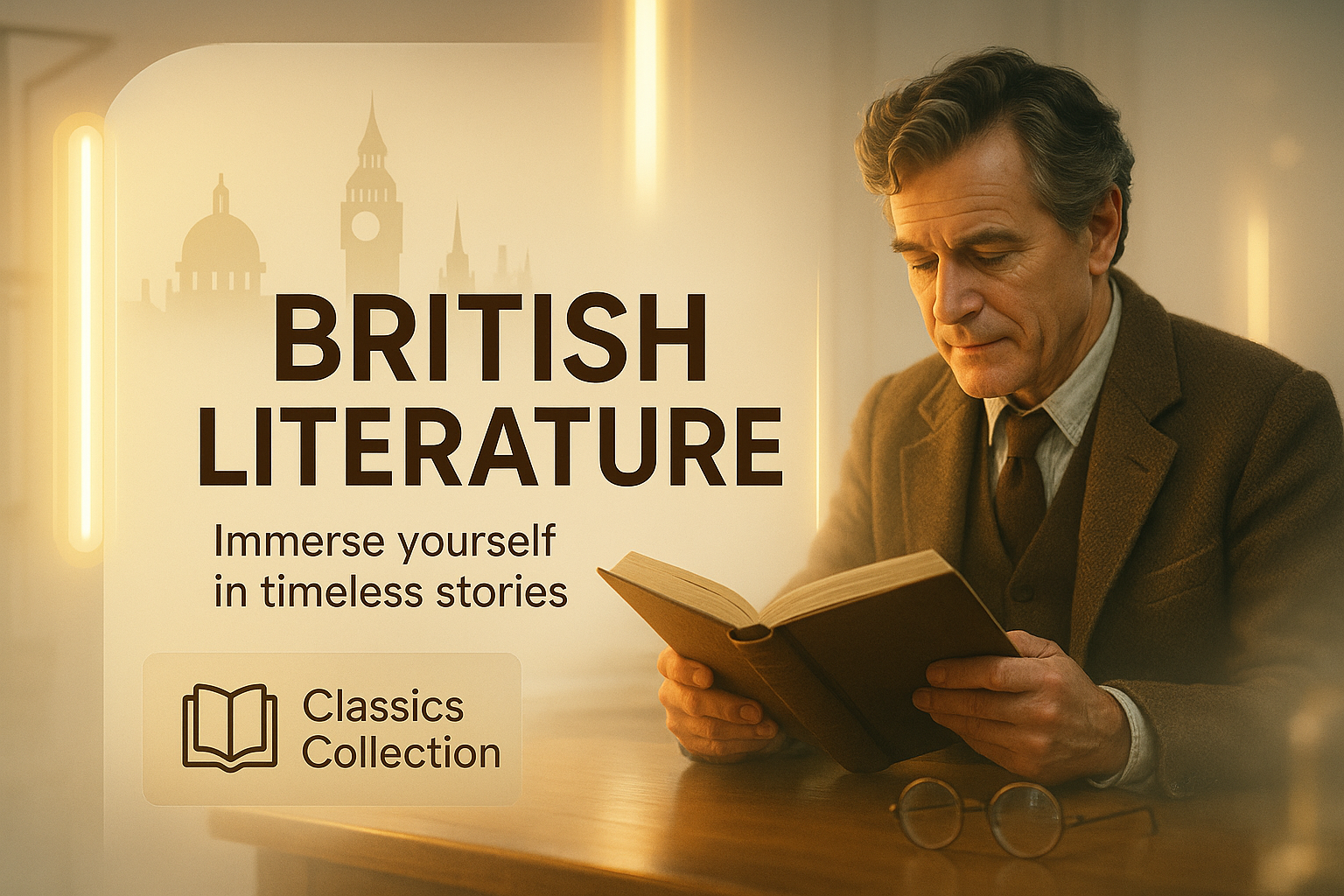 Engaging promotional graphic showcasing British literature, featuring a man reading a book, ideal for marketing classic literary collections.