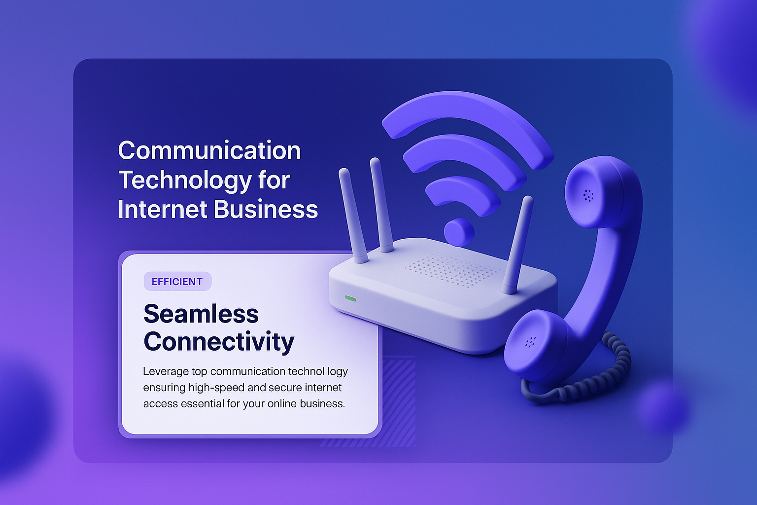/Collection: /by davooda/Type: PNG/A vibrant 3D illustration showcasing communication technology, featuring a router, phone, and dynamic graphical elements. The design emphasizes seamless connectivity for online business.