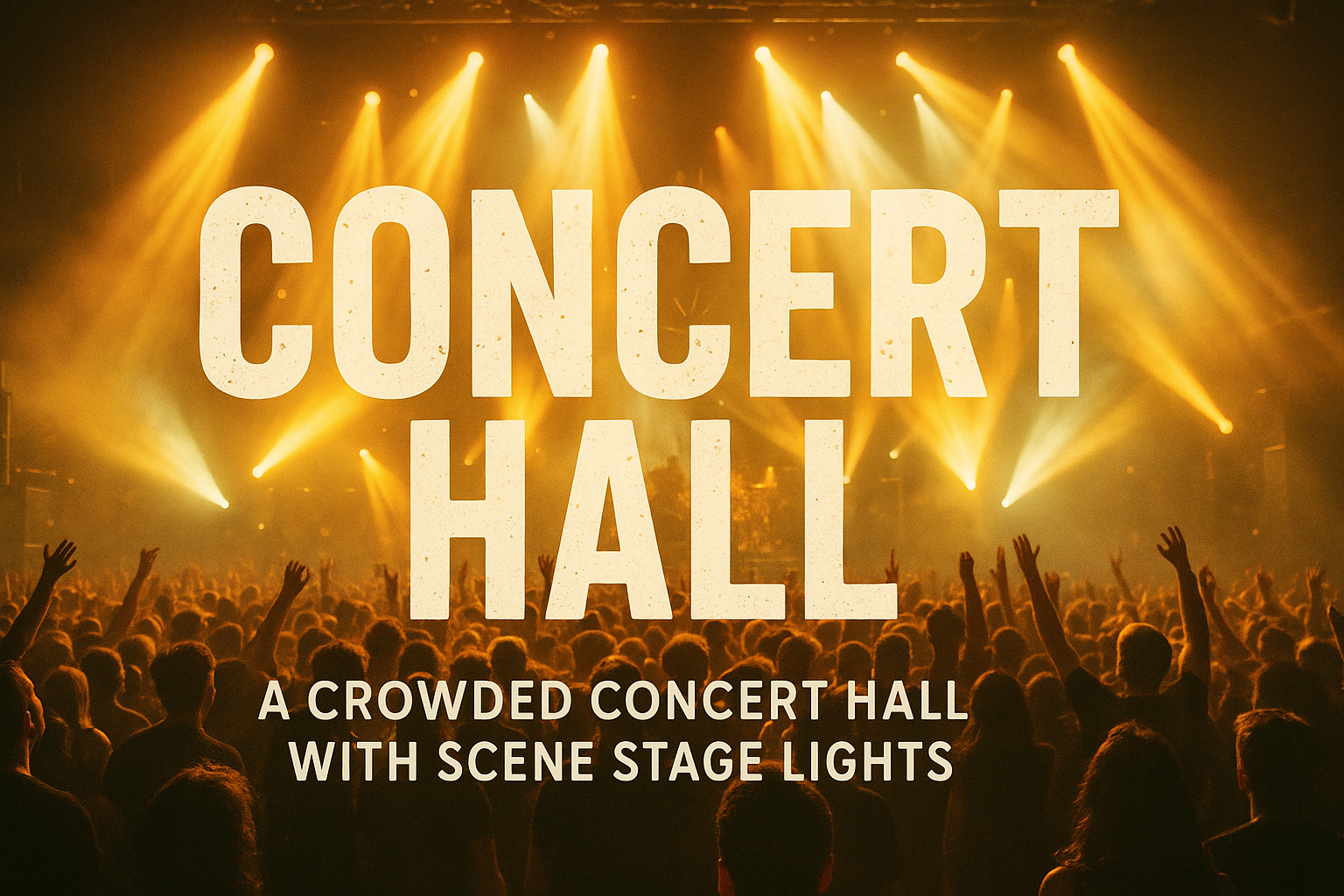 A lively concert hall filled with an enthusiastic crowd, illuminated by dramatic stage lighting. Ideal for promoting music events, concerts, or live performances.