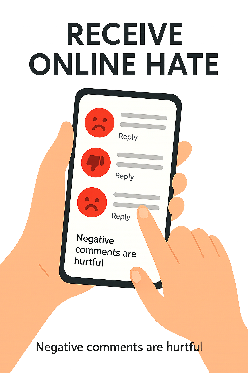 A digital illustration depicting a hand holding a smartphone with negative comments, highlighting the theme of online hate. Ideal for social media awareness campaigns.