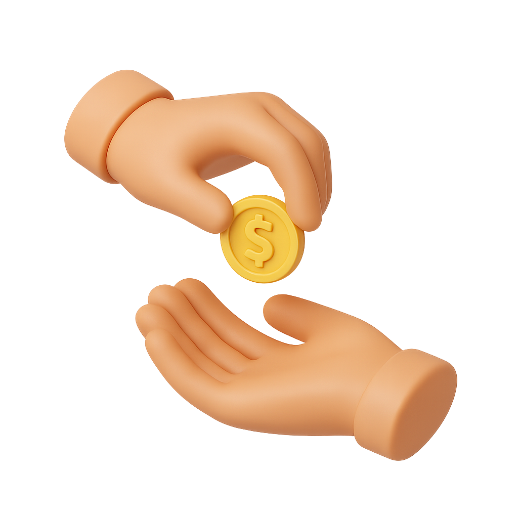 /Collection: /by davooda/Type: PNG/A visually appealing 3D illustration of two hands exchanging a coin, designed in an isometric style with a transparent background. The coin features a dollar symbol, emphasizing financial transactions.