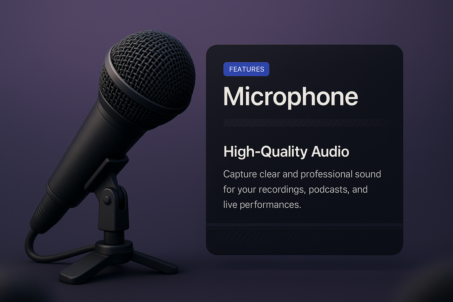 A detailed 3D rendering of a microphone on a gradient background, featuring text blocks that seamlessly integrate with the design, emphasizing high-quality audio.