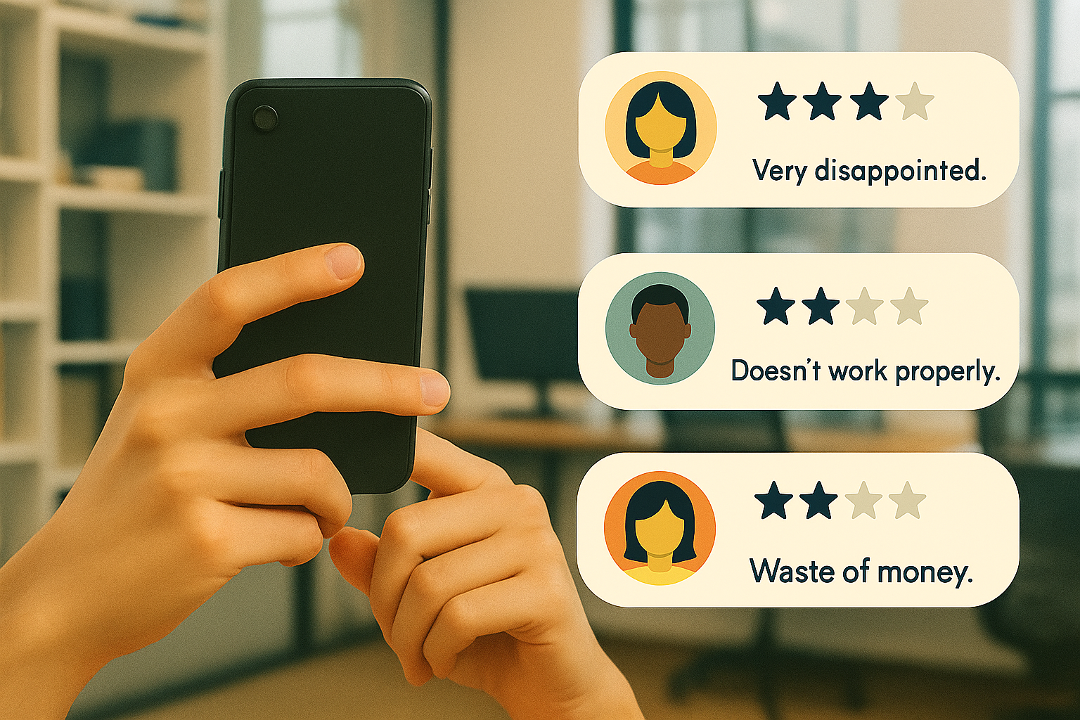 /Collection: /by davooda/Type: PNG/Illustrative graphic depicting customer reviews with star ratings and user comments, designed for a digital marketing context. Ideal for websites or social media.