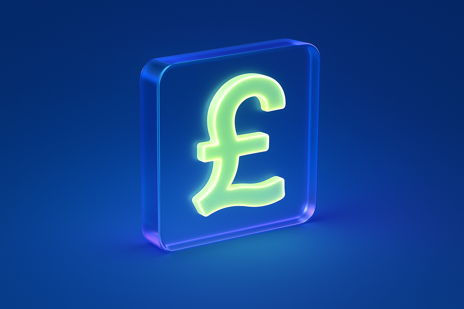 A luminous 3D pound symbol icon displayed in a semi-transparent glass format, radiating soft light against a solid blue background, creating a serene atmosphere.