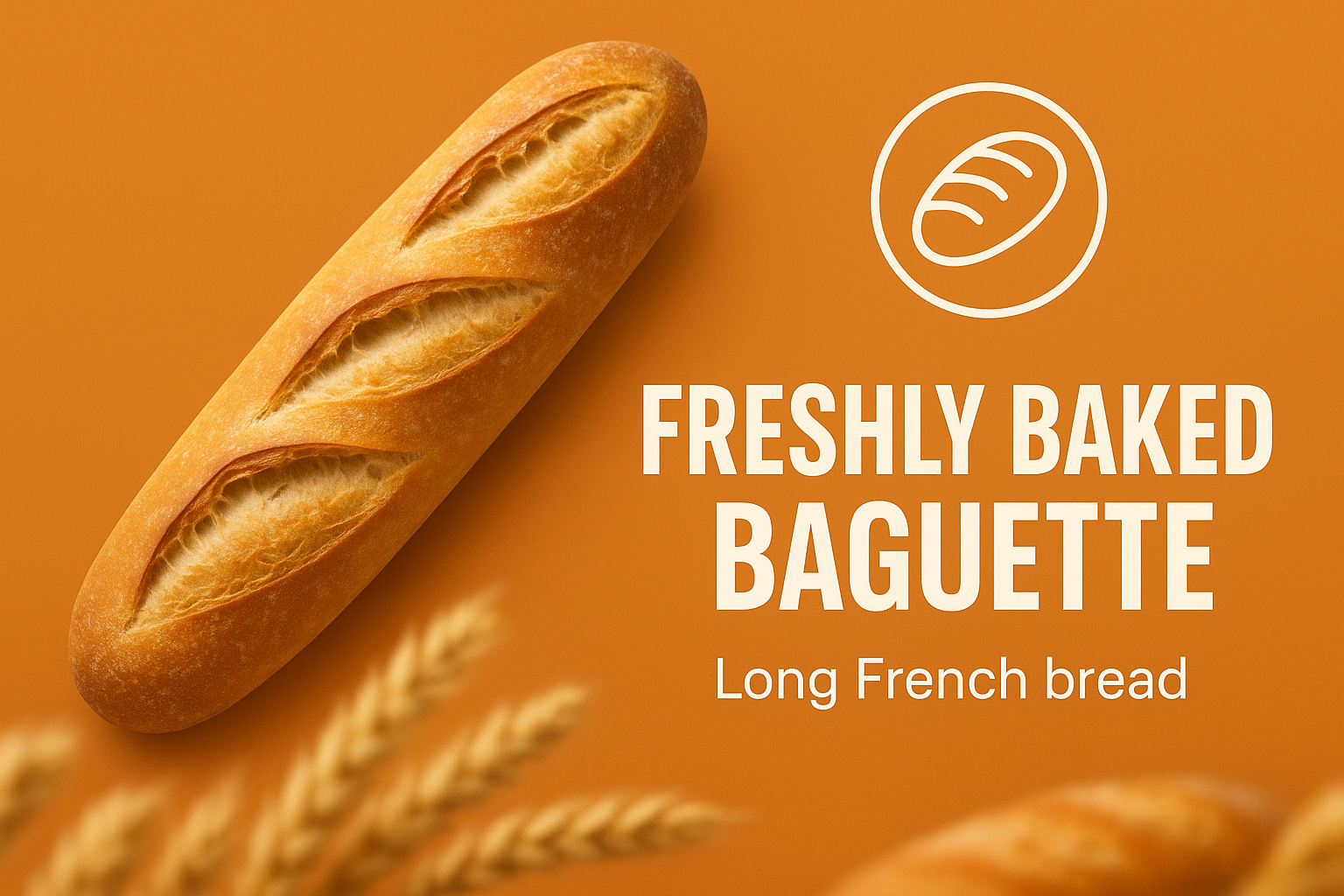 A visually appealing image featuring a freshly baked baguette against a warm orange background, ideal for bakery promotions or food-related content.