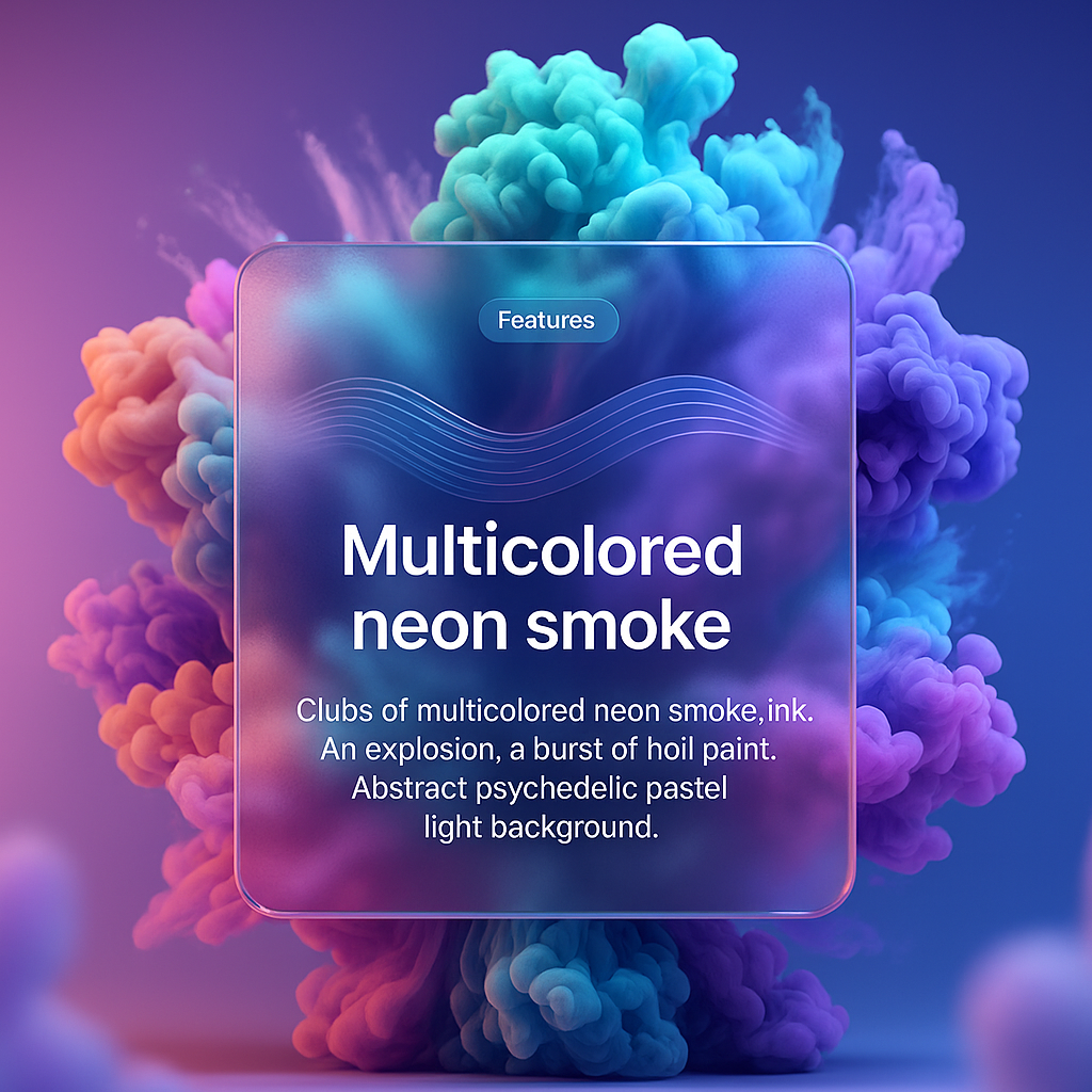 An abstract 3D rendering featuring colorful neon smoke clouds, creating a psychedelic pastel light background. The design incorporates a transparent block with features and graphics.
