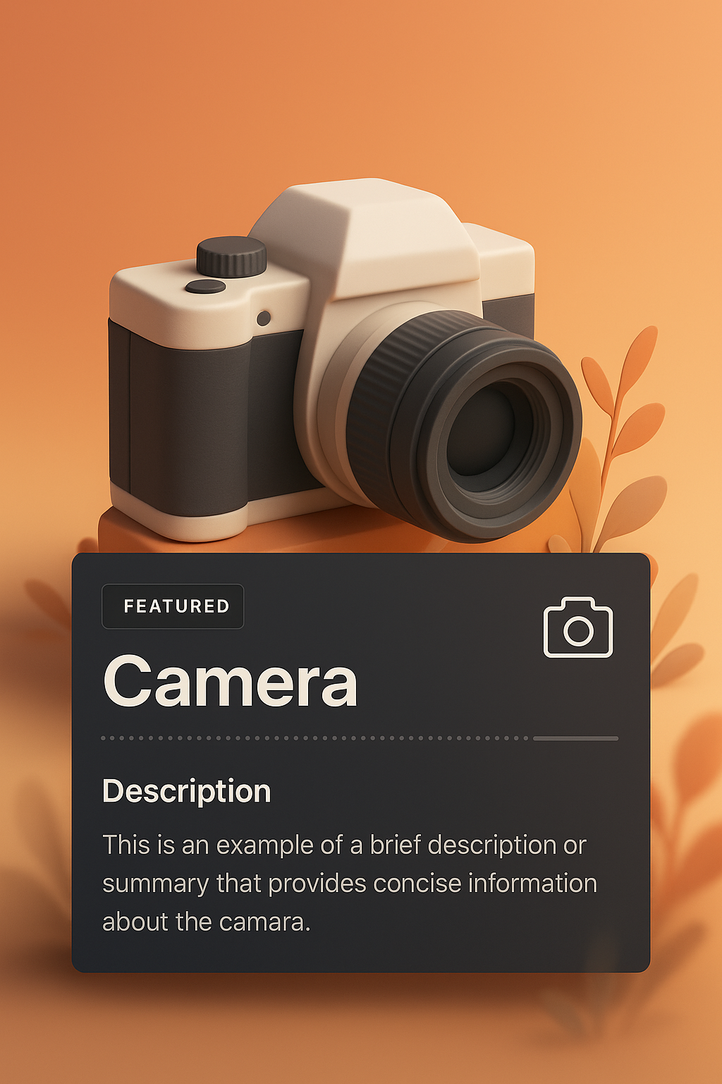 A visually striking 3D illustration of a camera set against a gradient background. The design features integrated text blocks that provide concise information, enhancing the visual appeal.