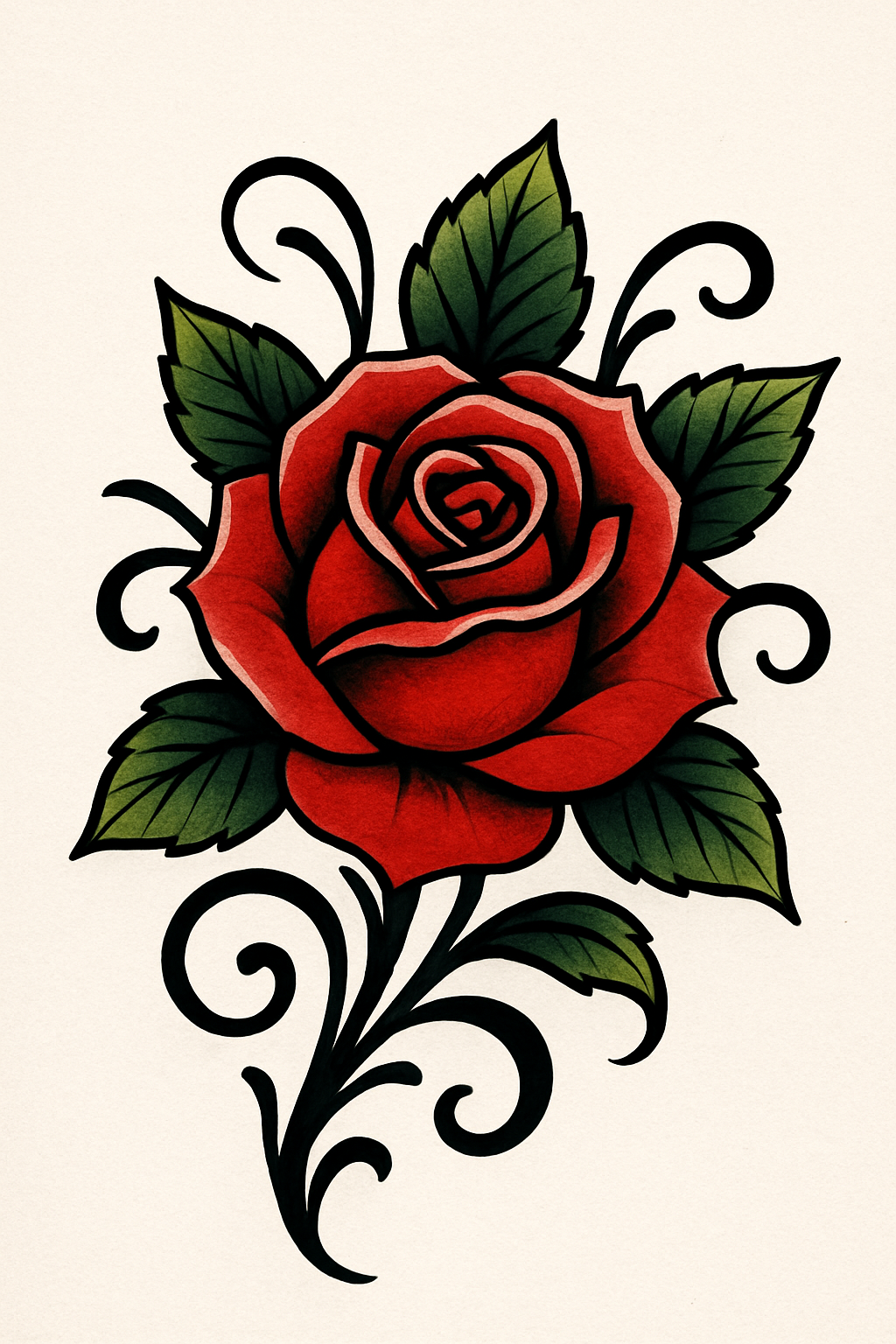 /Collection: /by davooda/Type: PNG/A striking vintage-style rose tattoo illustration featuring rich red petals and intricate green leaves, complemented by decorative swirling elements, ideal for tattoo art and design inspiration.